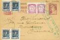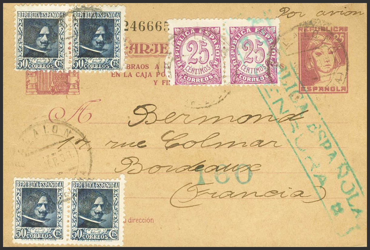 EP79, 738(4), 749(2). 1938. 25 cts lilac on Postal Card from BADALONA to BORDEAUX (FRANCE), with complementary postage of 50 cts blue, four stamps and 25 cts lilac, two stamps. MAGNIFICENT AND RARE.