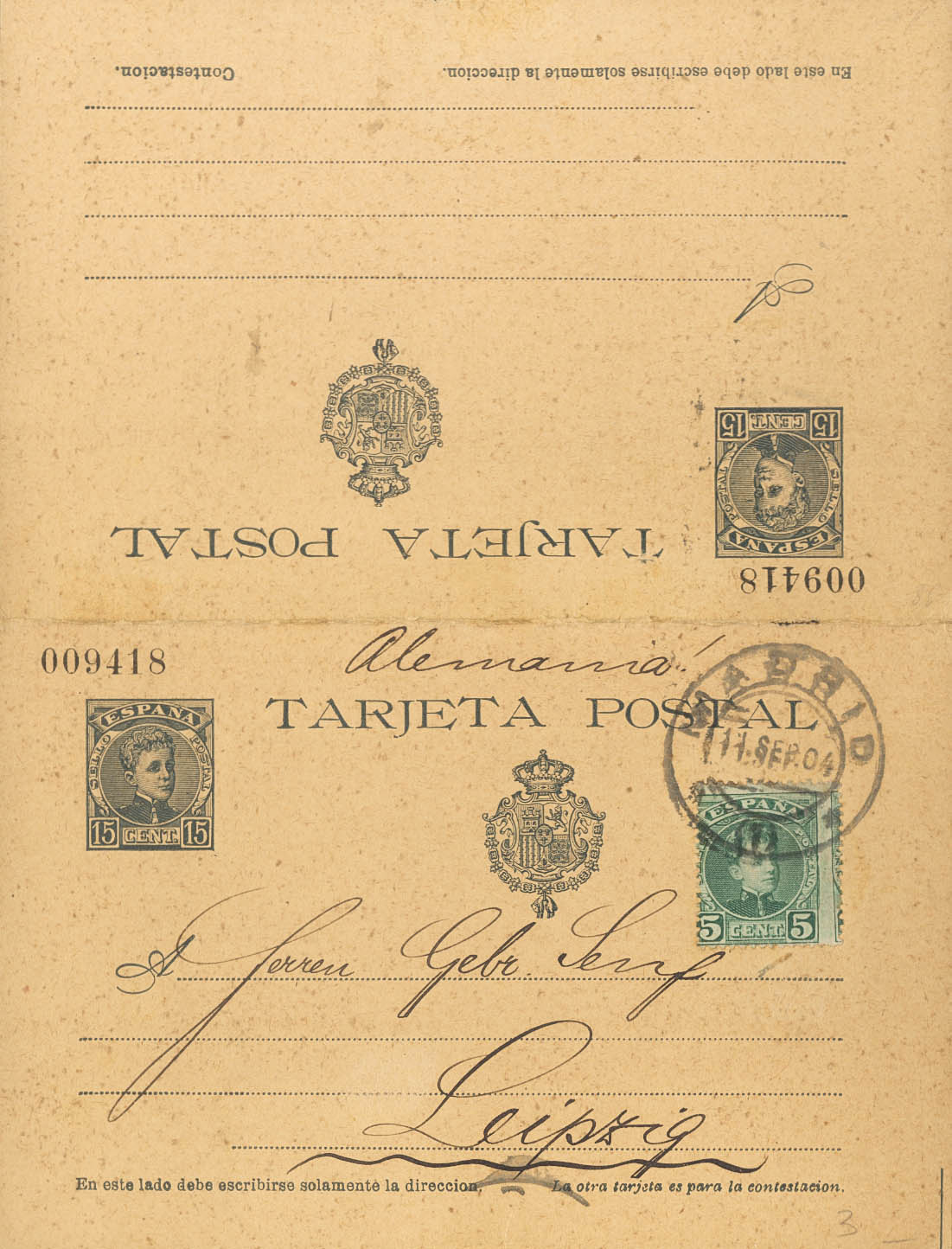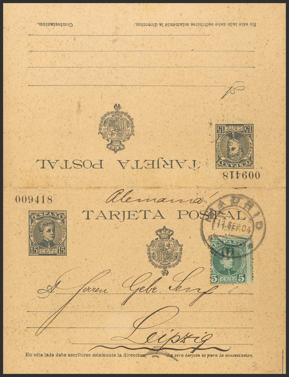 EP38. 1904. 15 cts+15 cts slate on Whole Postal Card (round trip), one-way circulated from MADRID to LEIPZIG (GERMANY), with complementary postage of 5 cts green. MAGNIFICENT AND RARE.