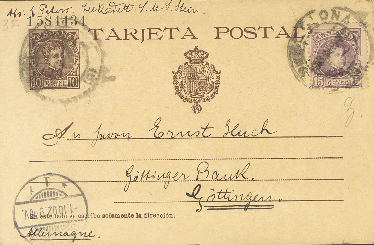 EP37. 1902. 10 cts chestnut on Postal Card from BARCELONA to GOTTINGEN (GERMANY), with complementary postage of 15 cts lilac. At the front arrival. MAGNIFICENT AND RARE, LAIZ DOES NOT CATALOG THIS EXCEPTIONAL COMBINATION.