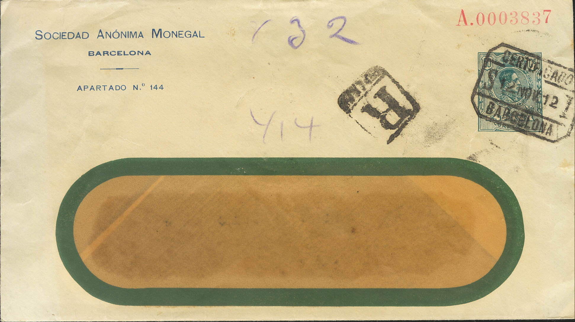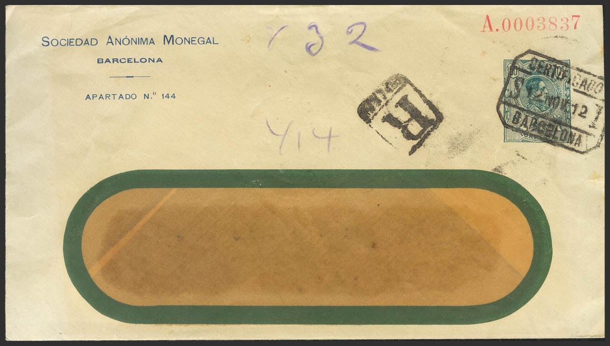 EP373. 1912. 50 cts blue on Private Postal Whole SOCIEDAD ANONIMA MONEGAL from BARCELONA to DRESDEN (GERMANY). On the back arrival. MAGNIFICENT AND RARE. (Láiz 2006: 600 Euros)