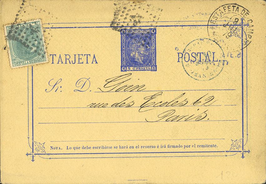 English EP8. 1879. 5 cts blue, Entire Postal Card envelope and 5 cts green, complementary postage. MADRID to PARIS. MAGNIFICENT.