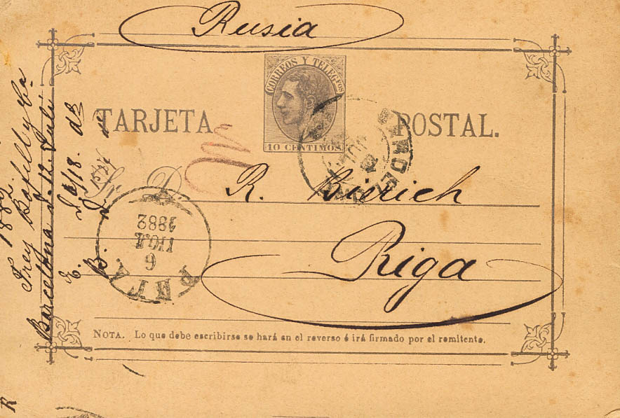 EP11. 1882. 10 cts violet gray Envelope Postal Card from BARCELONA to RIGA (RUSSIA until 1918), arrival on the front. MAGNIFICENT AND UNUSUAL DESTINATION.