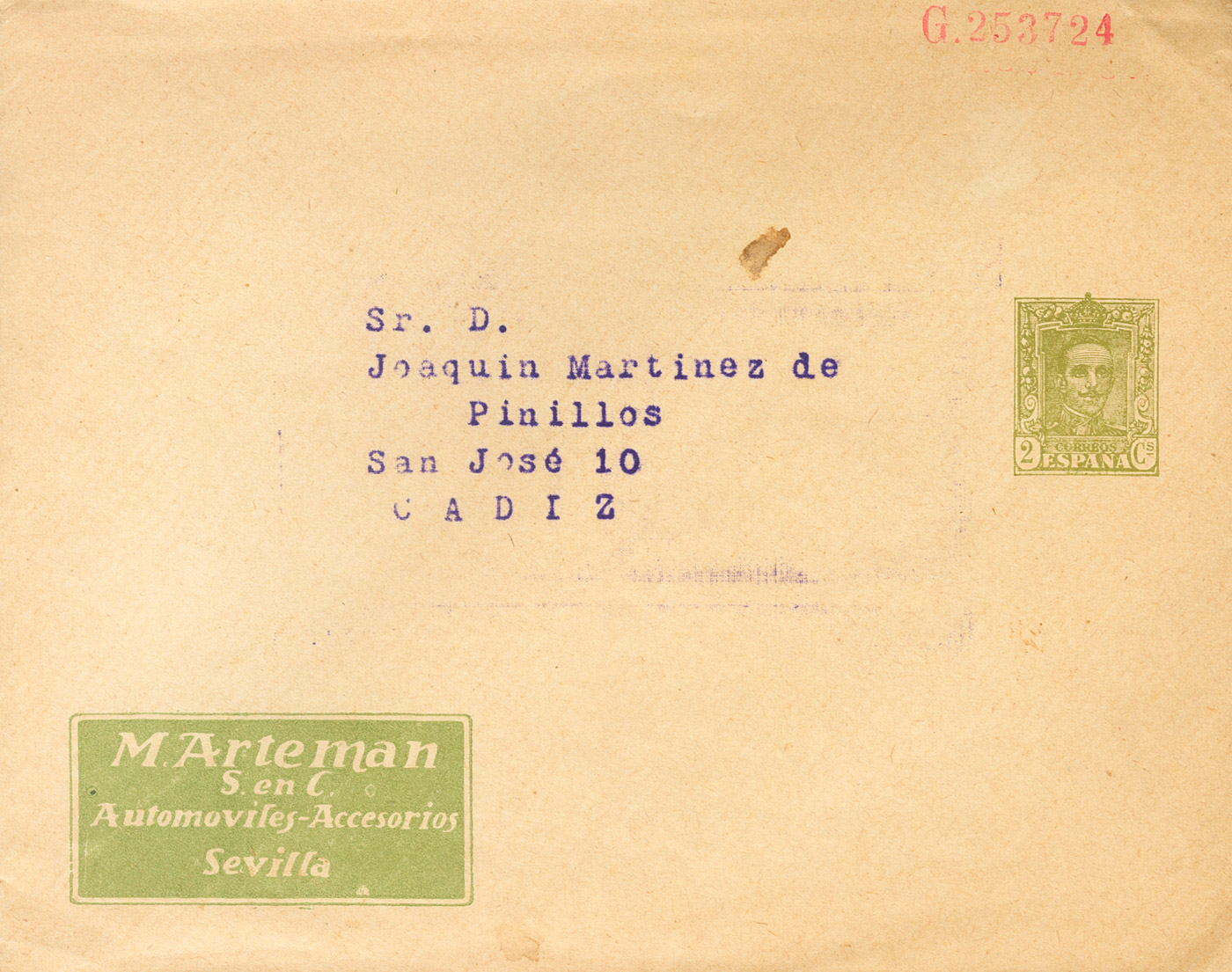 |ENVELOPE| EP625A. (1922ca). 2 cts olive green envelope Private Postal Stationery M.ARTEMAN from SEVILLE to CADIZ. MAGNIFICENT AND VERY RARE. (Láiz 2006: 900 Euros)