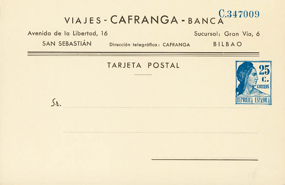 English (★) EP1077. 1935. 25 cts blue on Private Postal Stationery. CAFRANGA. MAGNIFICENT AND RARE. (Laiz 2000: 210 Euros)