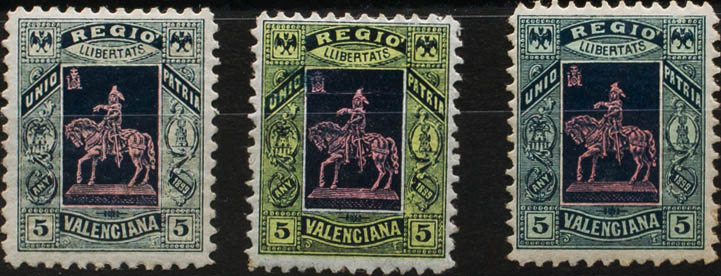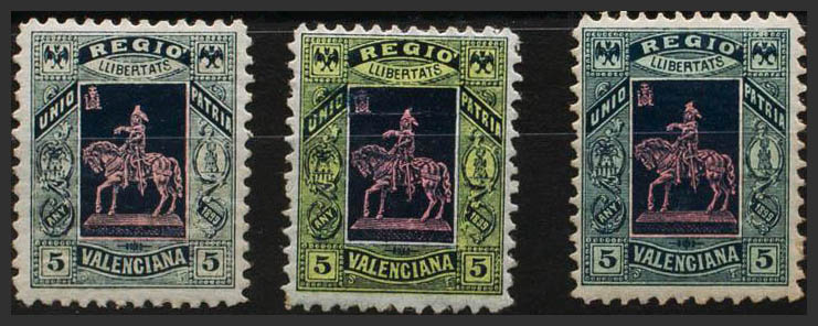★1899. Three vignettes of 5 cts in different colors. VALENCIAN REGION. MAGNIFICENT AND RARE. (Nathan V3)