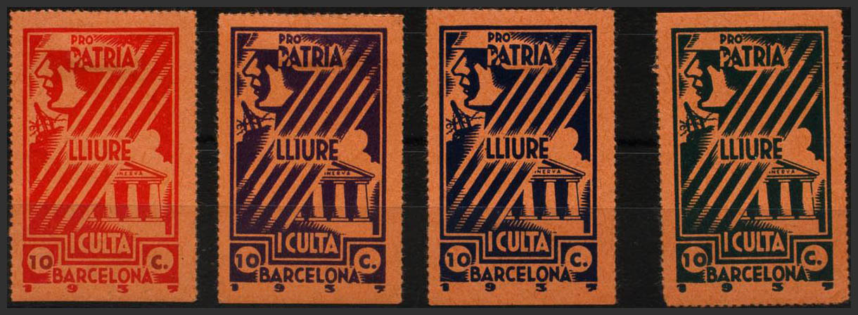 English ★/(★)1937. Four stamps of 10 cts in different colors. BARCELONA PRO PATRIA LLIURE I CULTA. MAGNIFICENT. (Allepuz 231, 234, 235, 236)