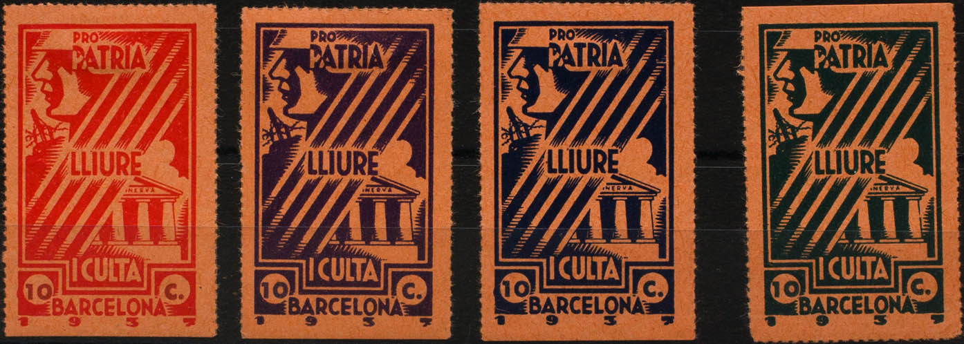 ★/(★)1937. Four stamps of 10 cts in different colors. BARCELONA PRO PATRIA LLIURE I CULTA. MAGNIFICENT. (Allepuz 231, 234, 235, 236)