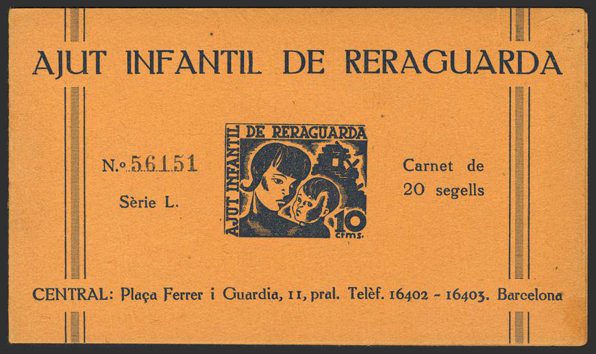 ★(1936ca). Complete card of twenty stamps of the 5 cts red AJUT INFANTIL DE RERAGUARDA. MAGNIFICENT AND VERY RARE. (Guillamón 2287, ID).