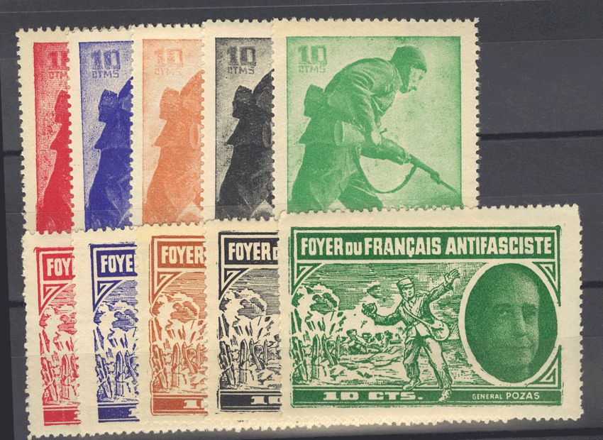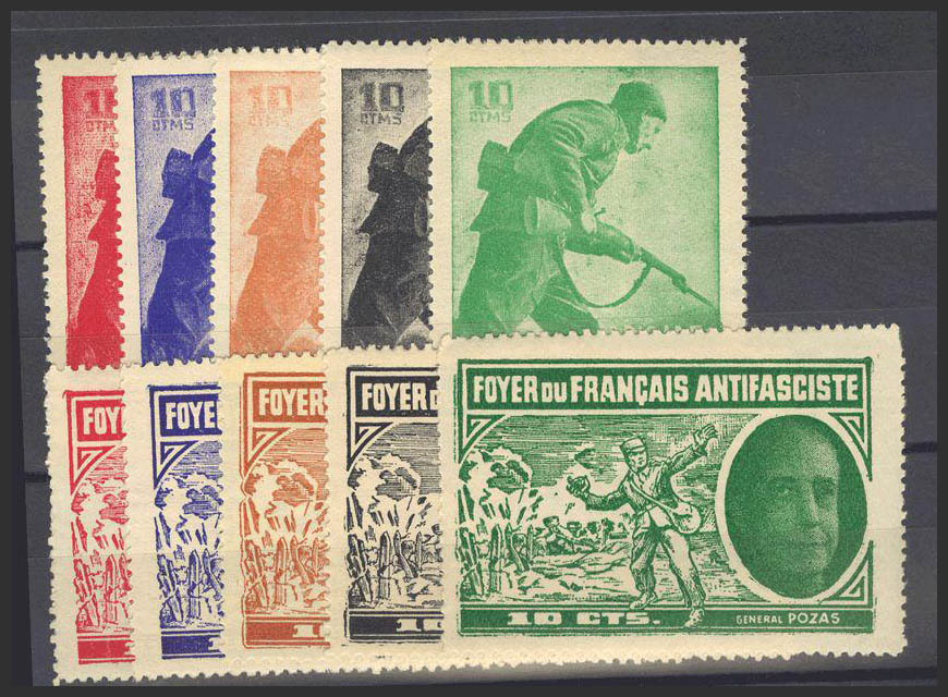 ★★/★1937. Complete series, in the five existing colors. FOYER DU FRANCAIS ANTI-FASCISTE. MAGNIFICENT. (Guillamon 2202/07A-E).