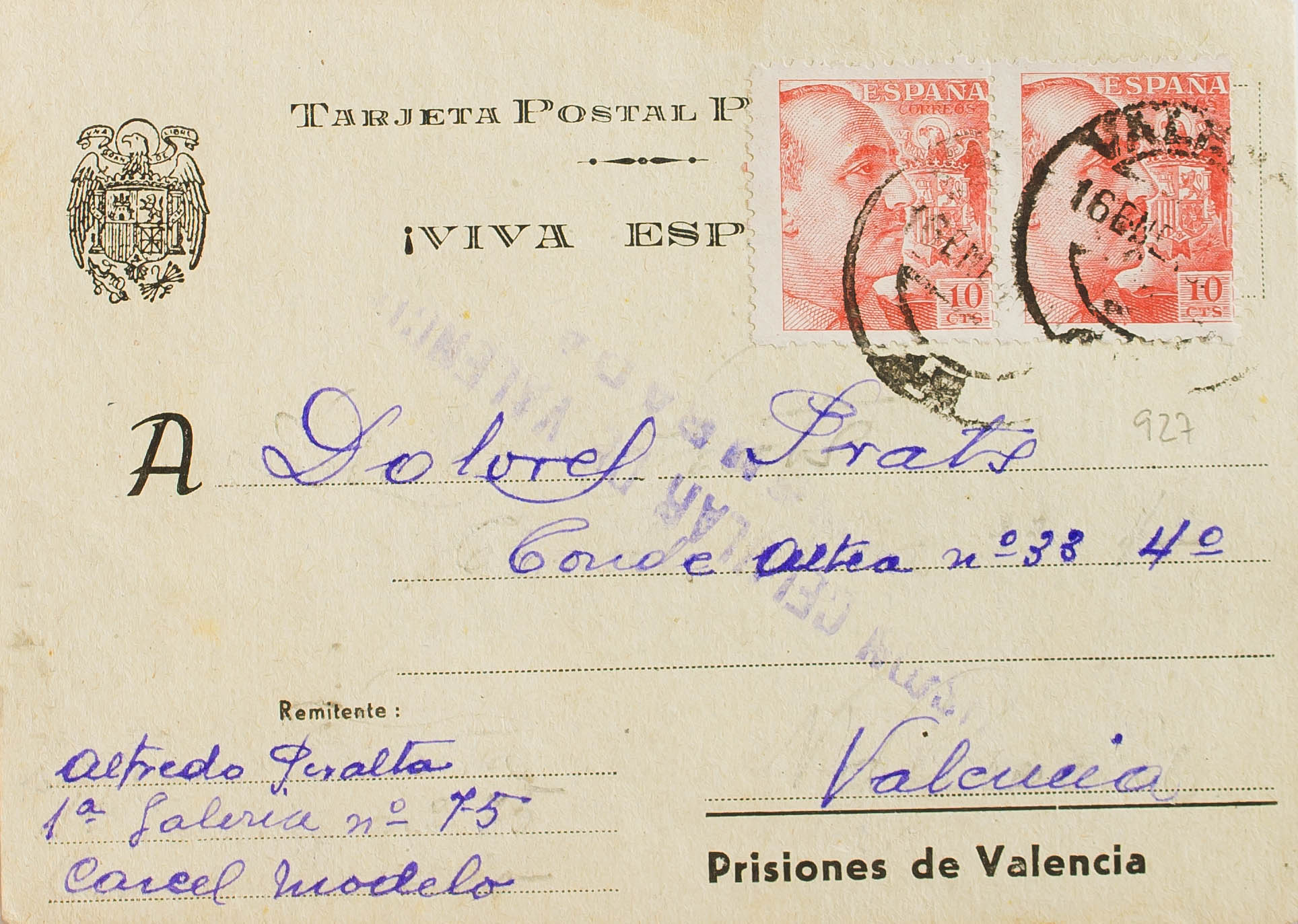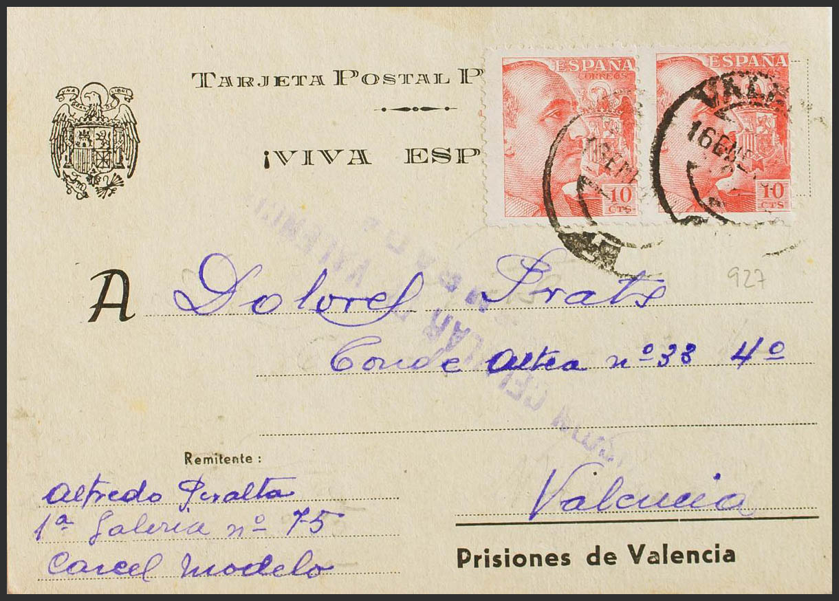 920(2). 1940. 10 chestnut cts, two stamps. Postal Card from Prisons from Valencia to VALENCIA (internal mail). On the front it marks PRISION CELLULAR DE VALENCIA / CENSURADA, in purple. MAGNIFICENT AND RARE.