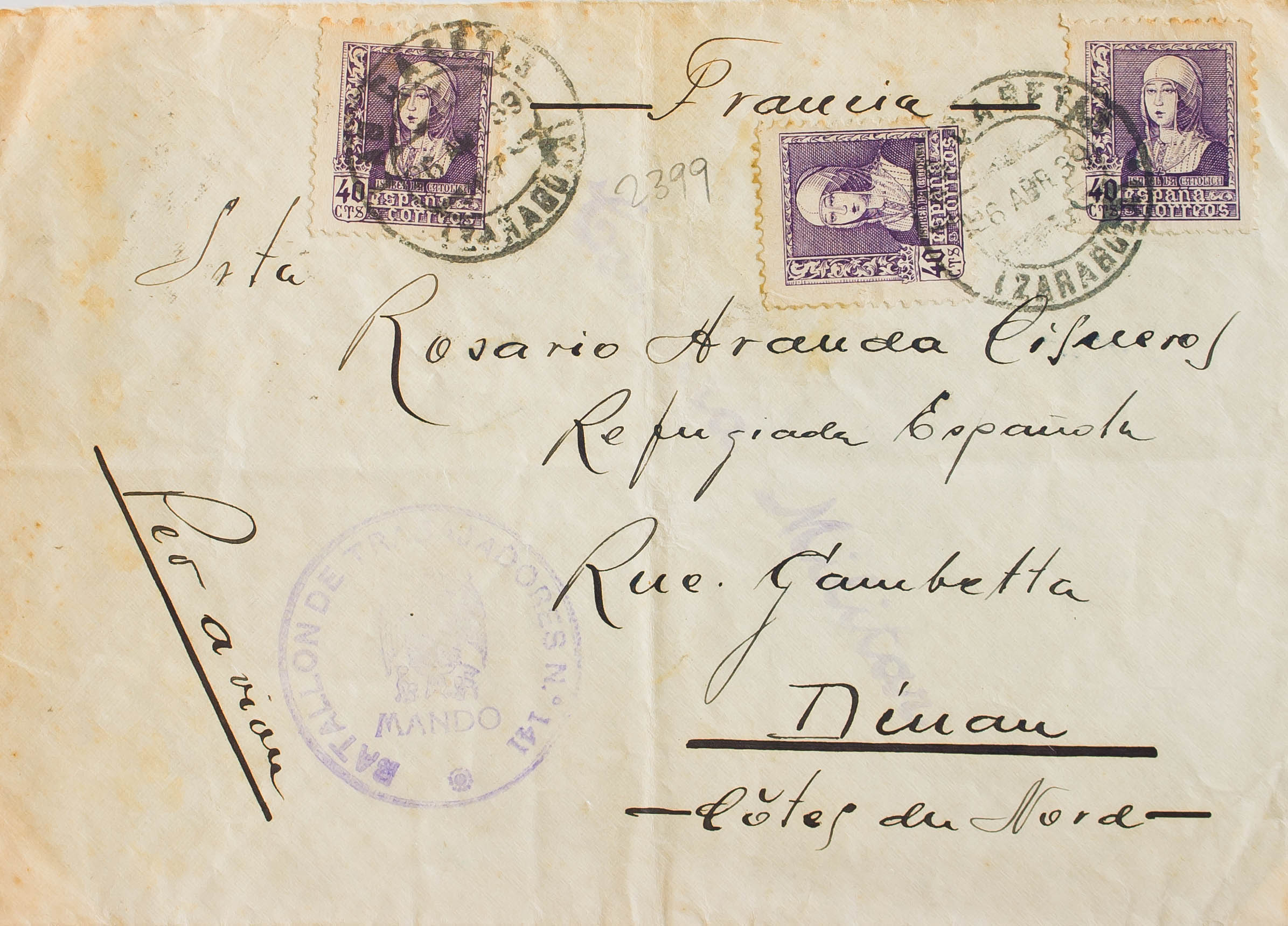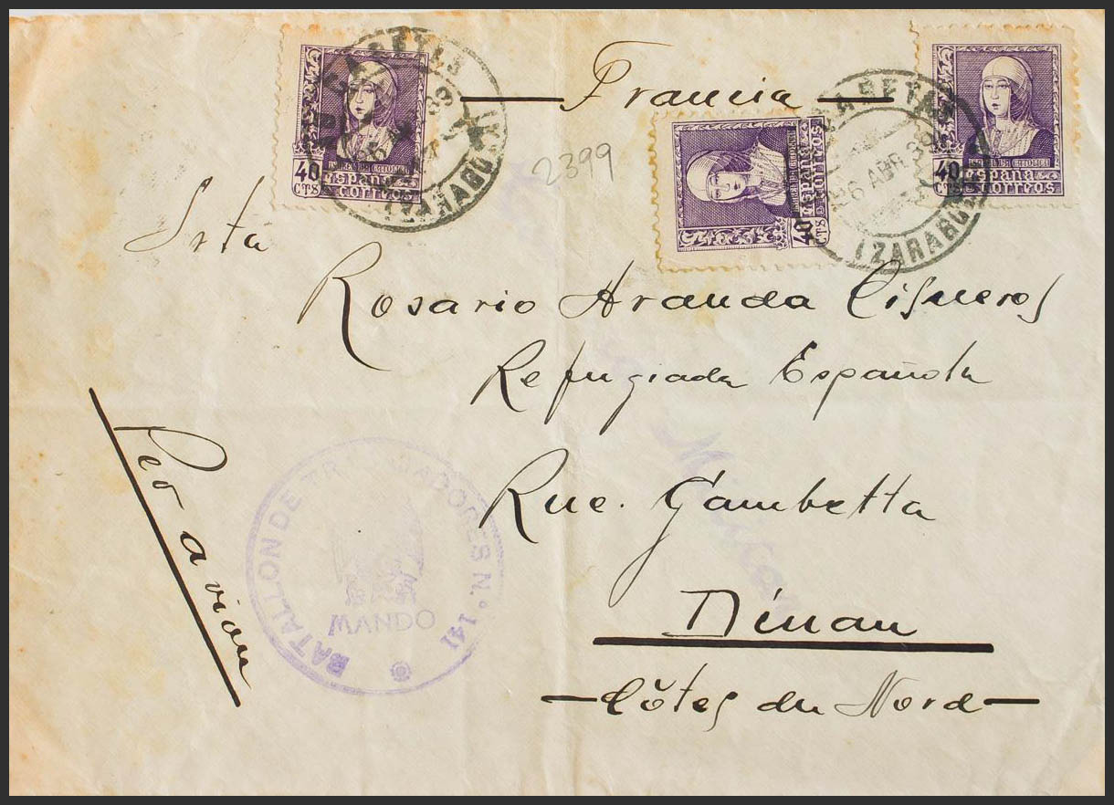 858(3). 1939. 40 violet cts, three stamps. LAS CASETAS (ZARAGOZA) to DINAU (FRANCE). On the front it marks BATTALION DE TRABAJADORES Nº141 / MILITARY COMMAND AND CENSURA, both in violet. MAGNIFICENT.