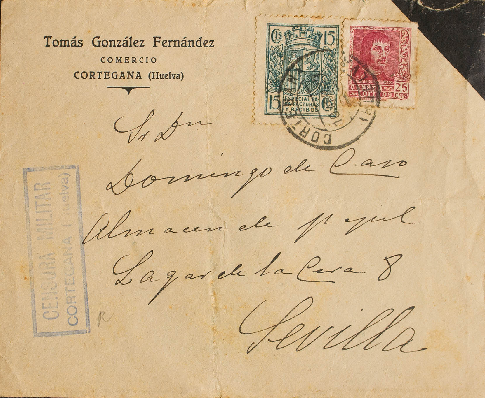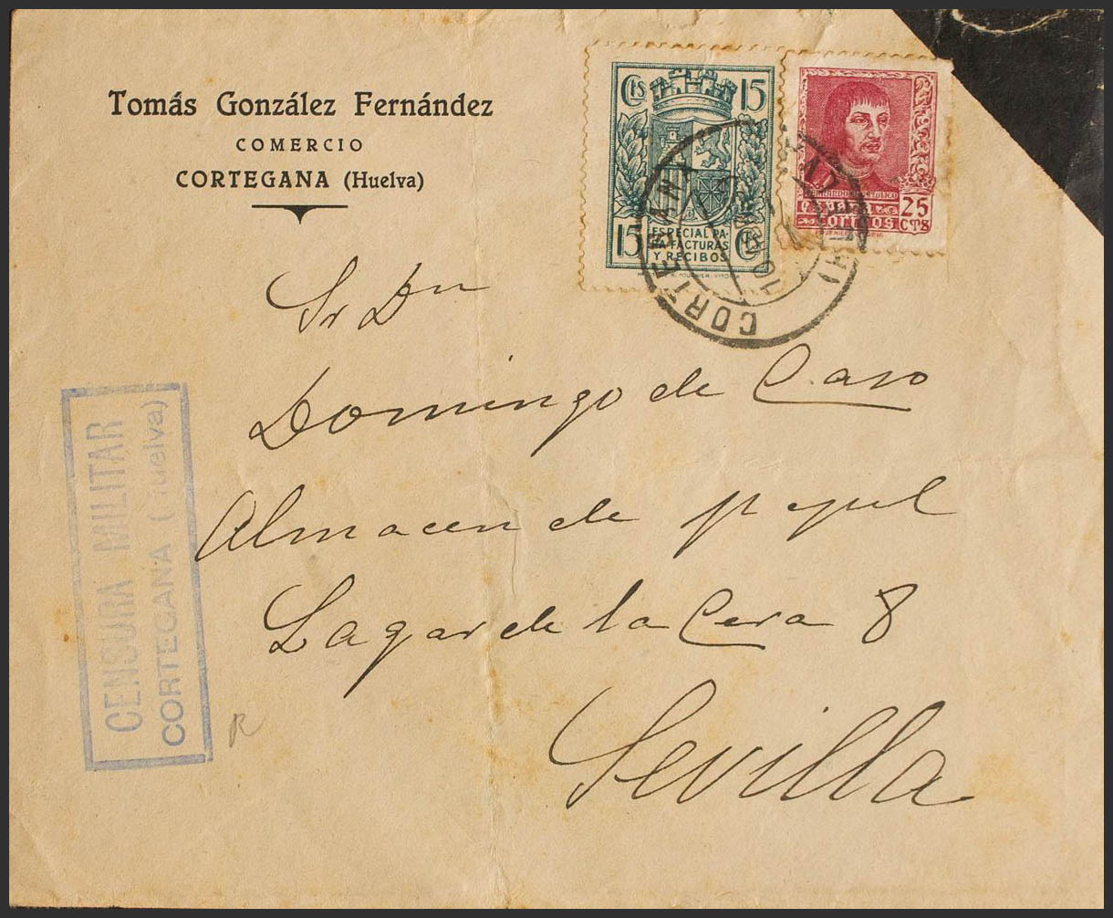 843, Fiscal 23. 1939. 25 cts lilac carmine and 15 cts fiscal blue green from INVOICES. CORTEGANA (HUELVA) to SEVILLE. MAGNIFICENT.