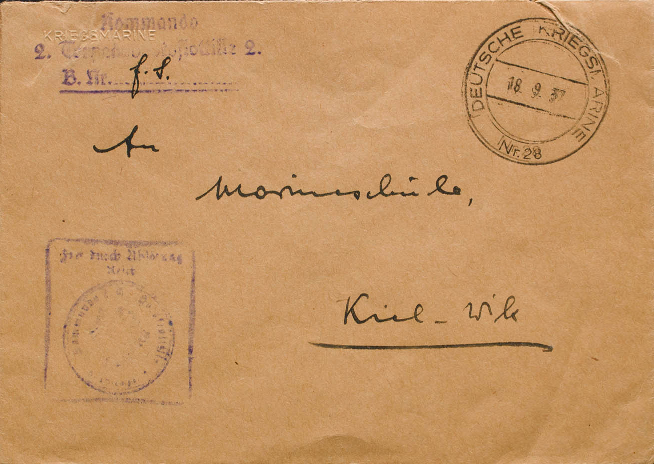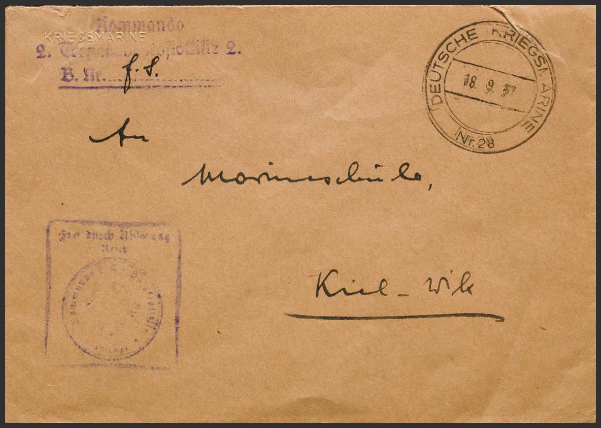English 1937. Cover of one of the Ships sent by Germany for the protection and control of the transport of war material to the troops of the National Side directed to KIEL (GERMANY). Torpedo boat mark in violet and date stamp DEUTSCHE KRIEGS-MARINE Nº28. MAGNIFICENT.