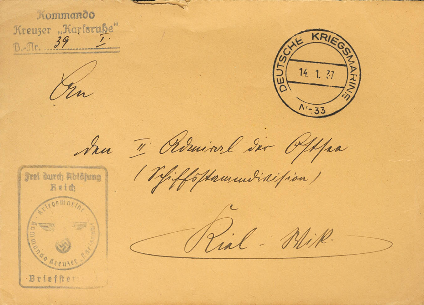 1937. Sent from the cruiser Karlsruhe and addressed to KIEL (GERMANY). Mark KOMMANDO / KREUZAR "KARLSRUHE" and dater DEUTSCHE KRIEGSMARINE / Nº33 (this ship participated in the Spanish Civil War as a neutral ship between 1936 and 1938). MAGNIFICENT.