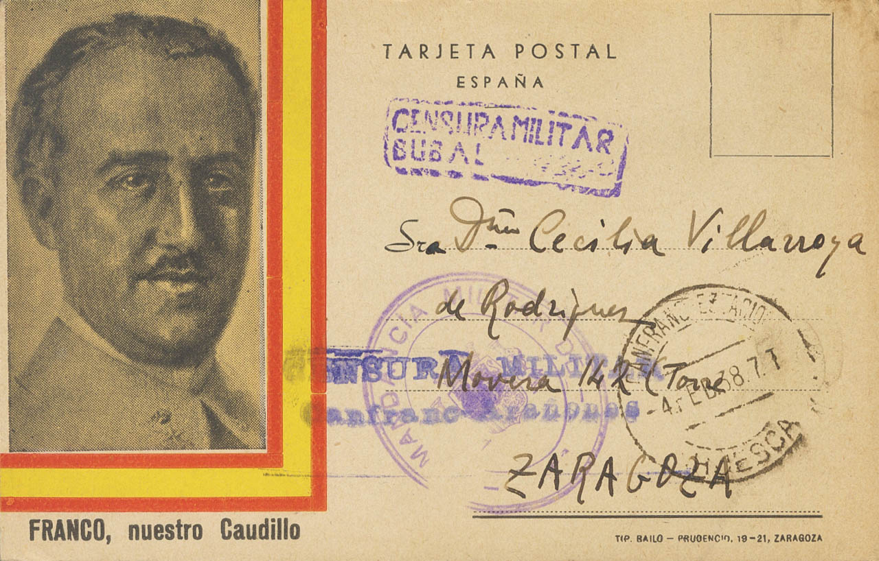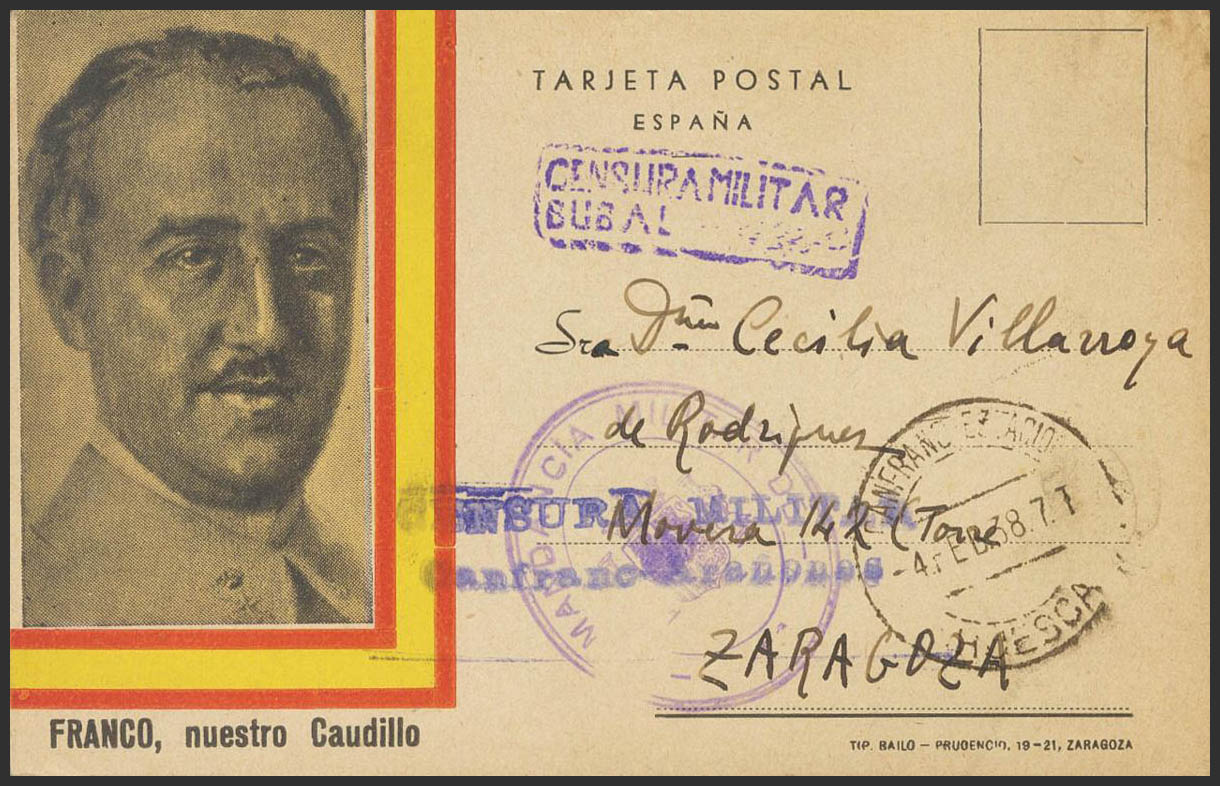 1938. Patriotic Postcard from BUBAL (TENA VALLEY, HUESCA) to ZARAGOZA. Franchise brand MILITARY COMMAND OF / JACA? and censor marks CENSURA MILITAR / BUBAL and CENSURA MILITAR / CANFRANC-ARAÑOÑES, both in violet. MAGNIFICENT AND RARE.