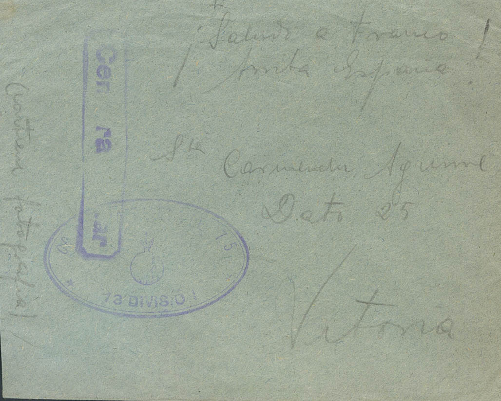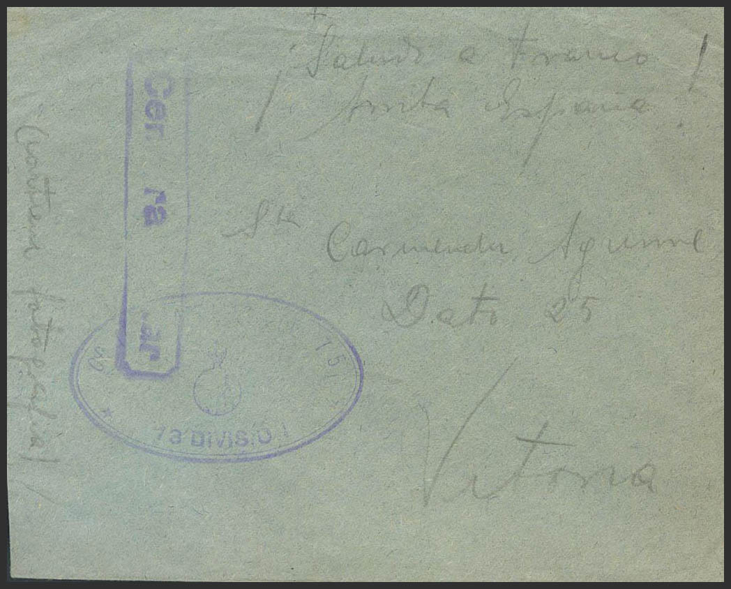 English 1938. Set of three letters addressed to VITORIA with the franchise mark GRUPO DE ARTILLERIA DE 75 / 13 DIVISION, in violet. MAGNIFICENT.