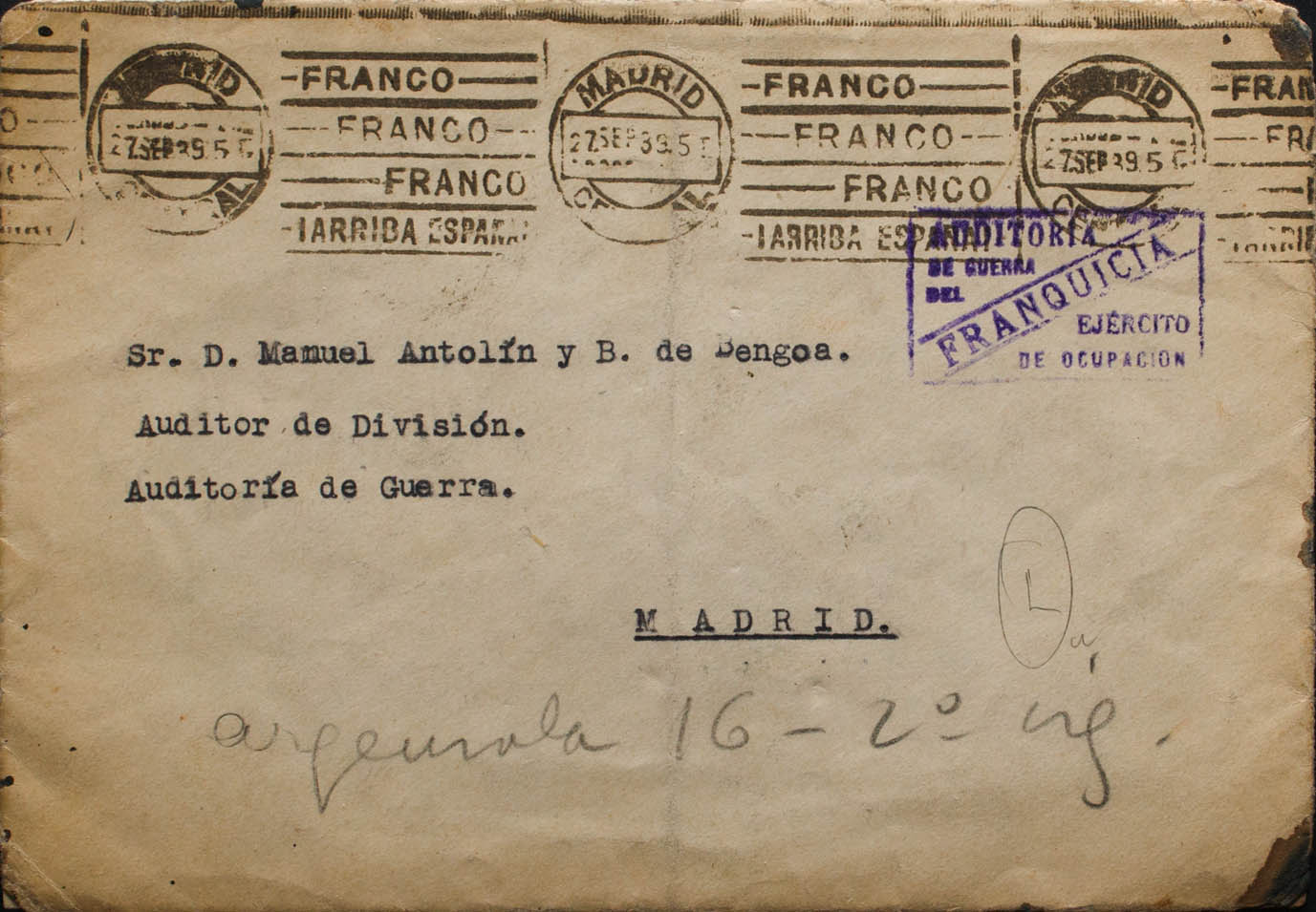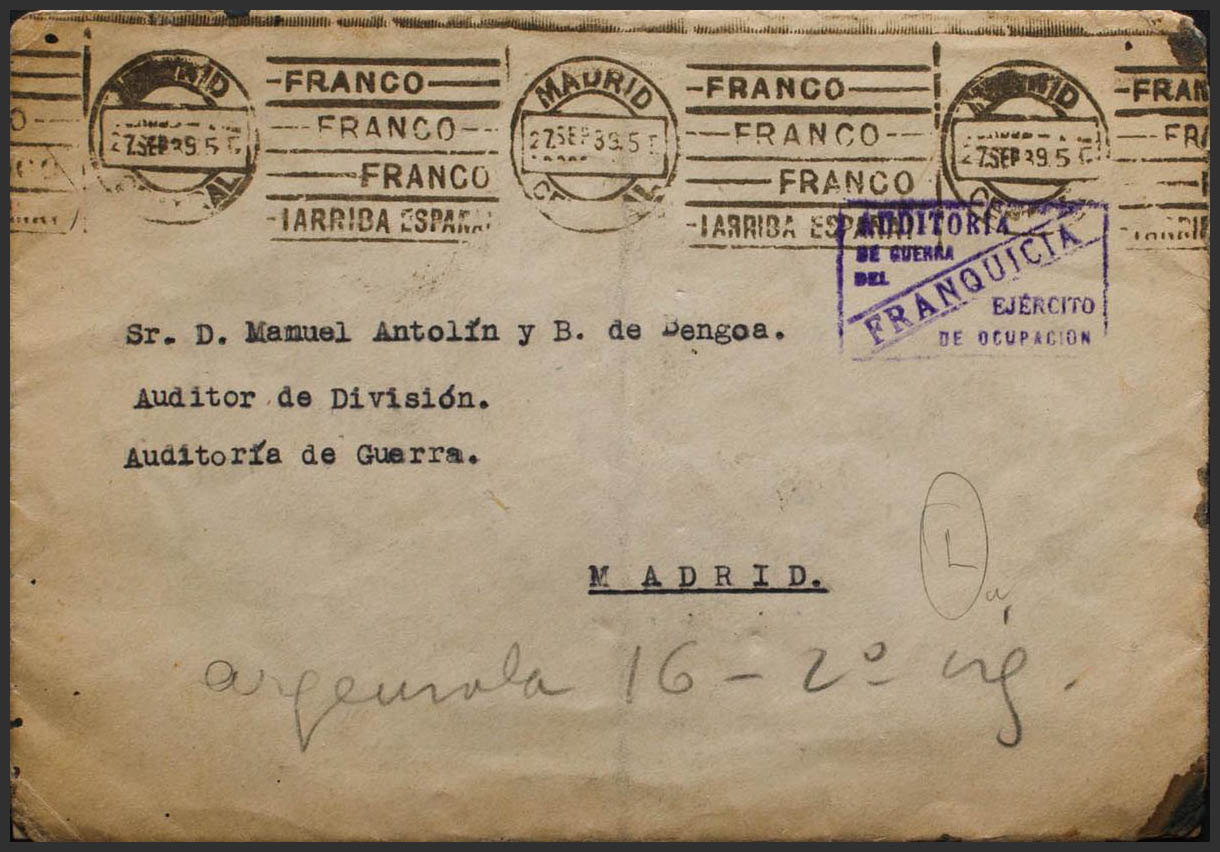 English 1939. Internal Mail of MADRID. Franchise mark AUDITORIA / DE GUERRA / DEL / EJERCITO / DE OCUPACION, in violet and arrival on the back. BEAUTIFUL AND RARE.