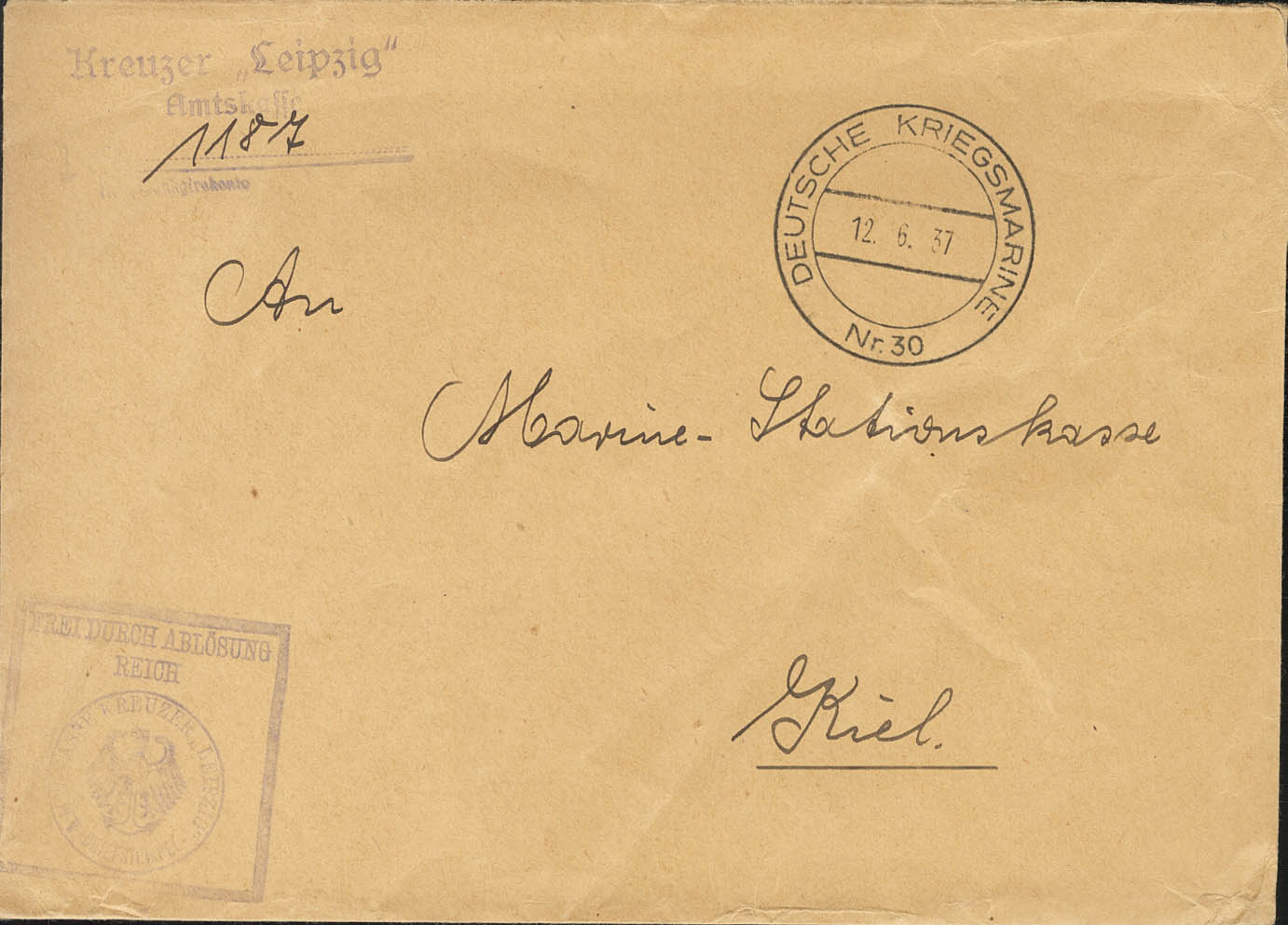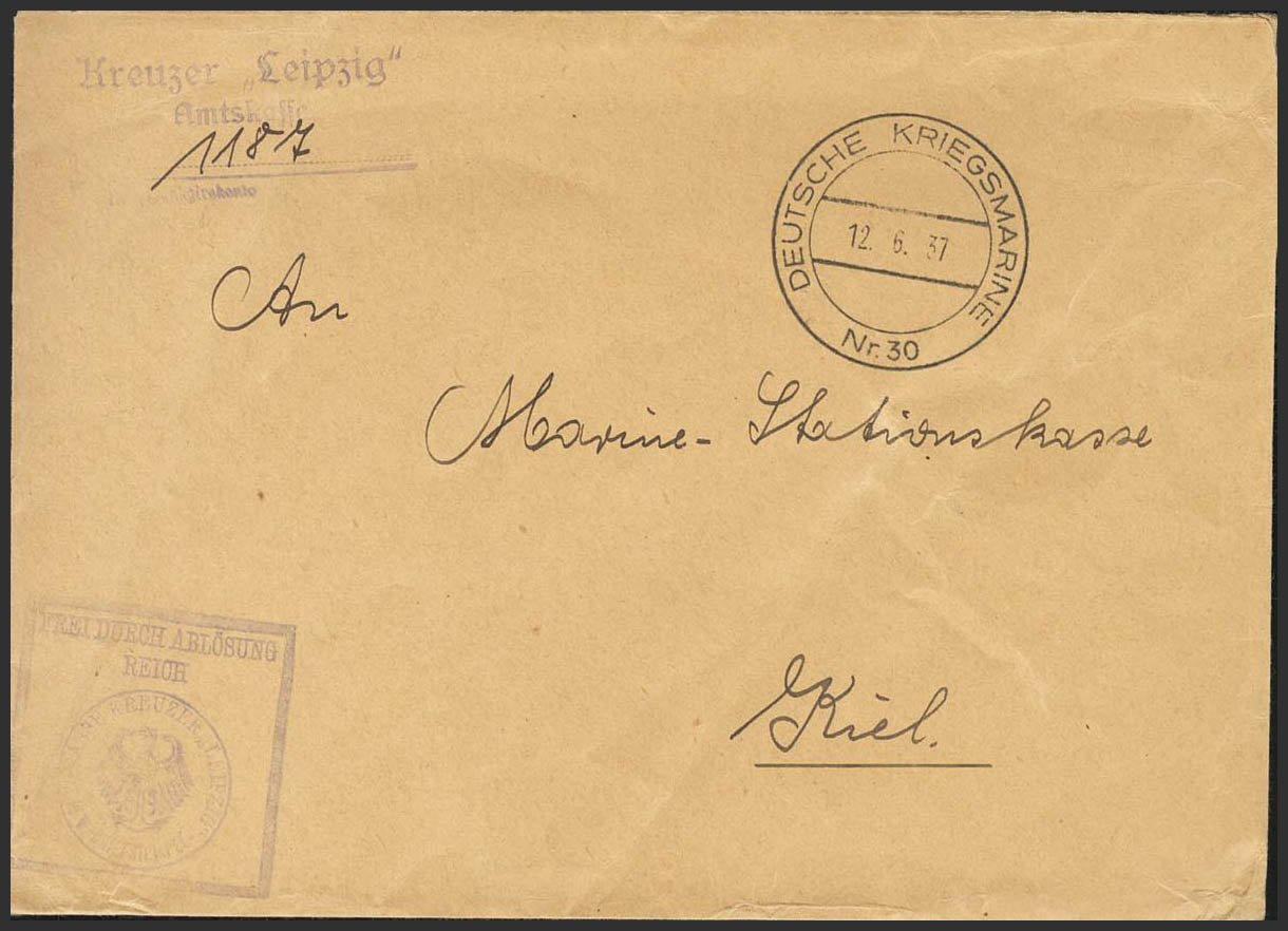 1937. Cover from the cruise ship LEIPZIG (purple markings) addressed to KIEL (GERMANY). DEUTSCHE KRIEGSMARINE / NR30 dater, this ship was one of those that participated in the protection and control of the troops of the national side, in the so-called Non-Intervention Committee. MAGNIFICENT.