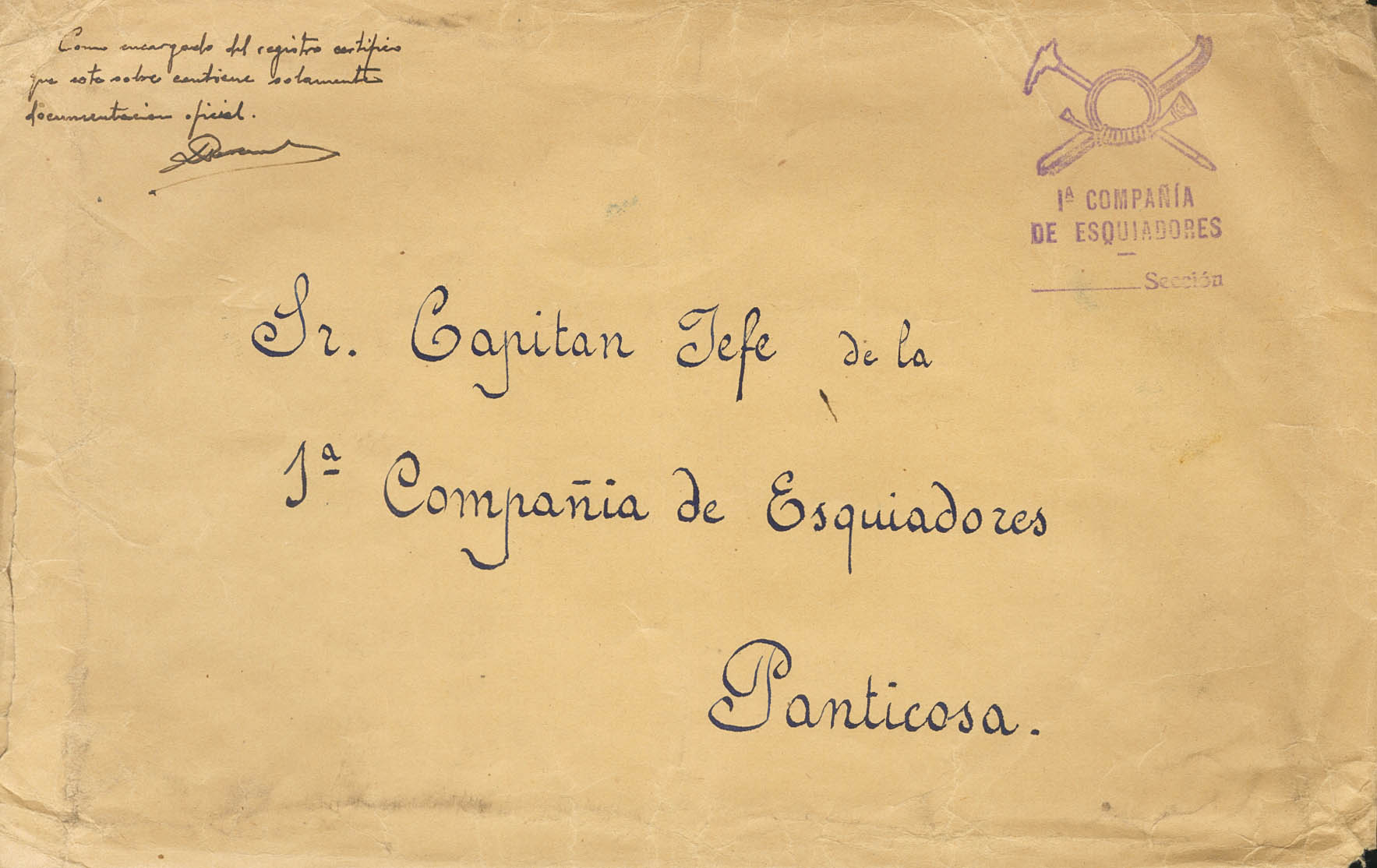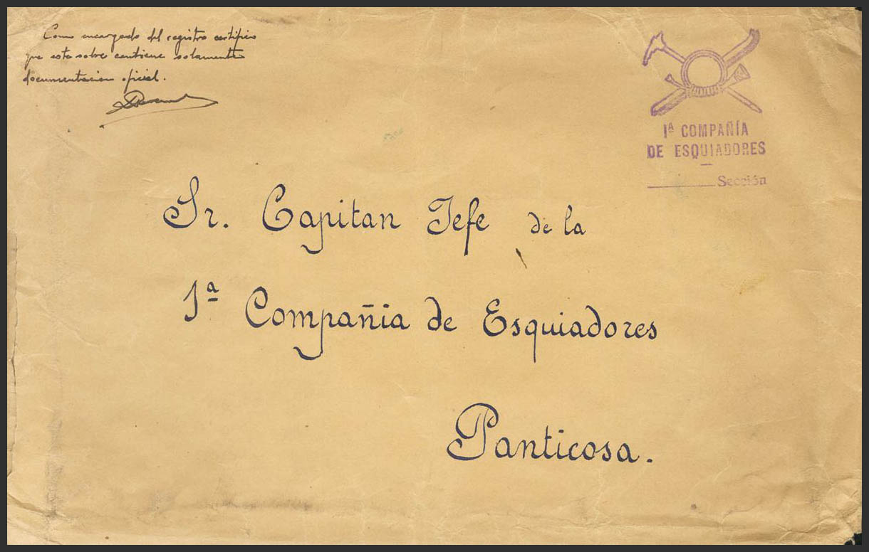 (1937ca). Addressed to PANTICOSA. 1st COMPANY / SKIERS brand, in purple. MAGNIFICENT.