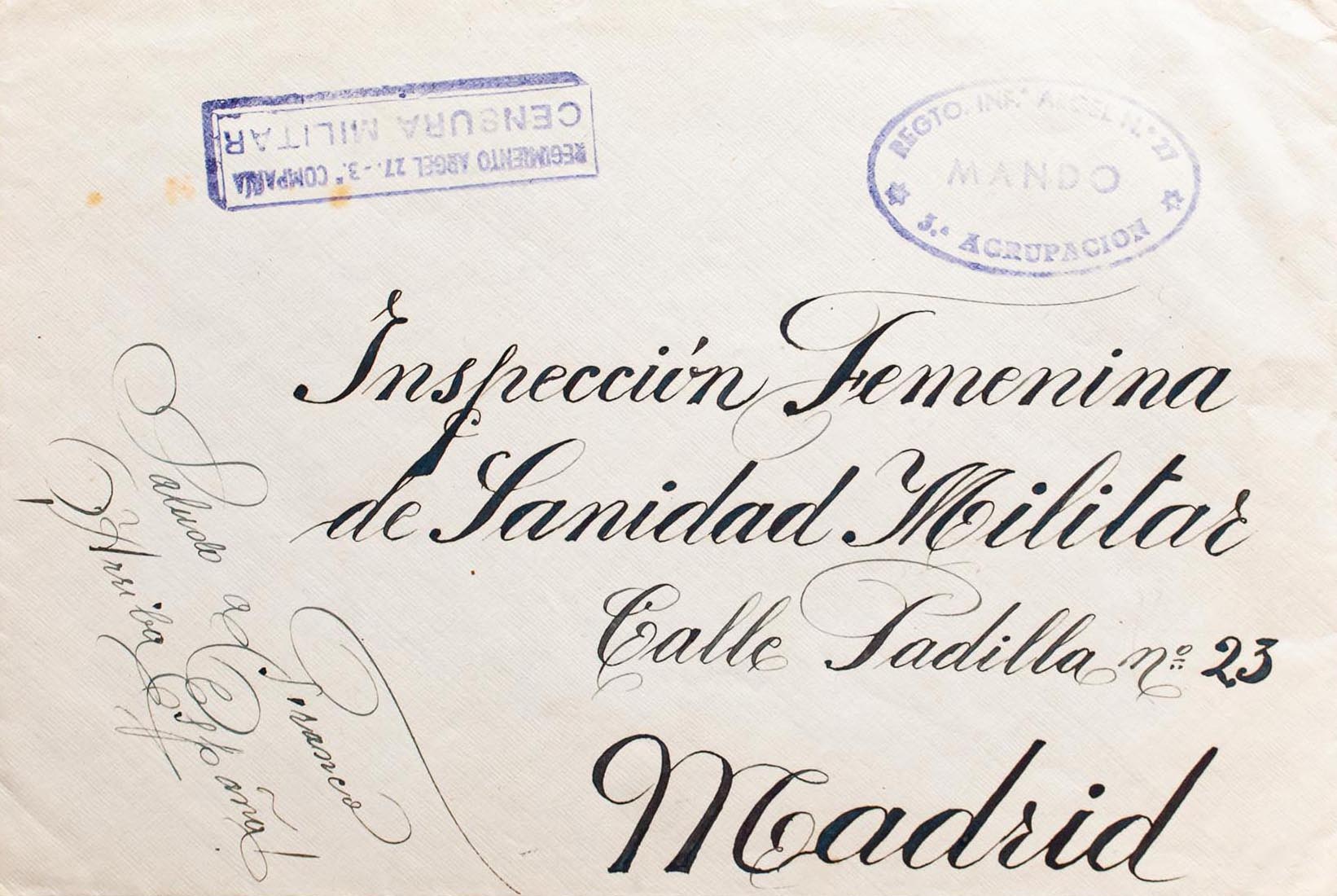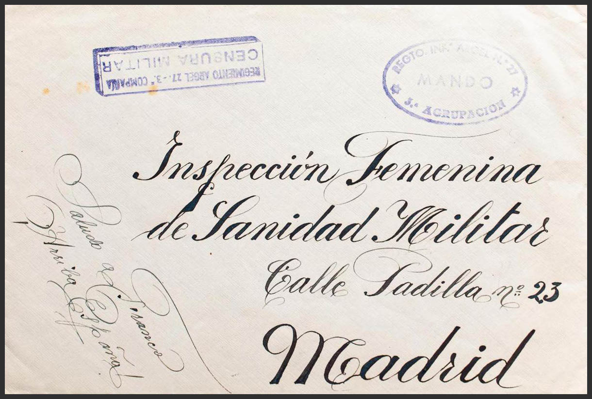 1939. SEVILLEJA DE LA JARA (TOLEDO) to MADRID. Marks REGTº INFª ALGIERS Nº27 / COMMAND / 3rd GROUP AND REGIMENT ALGIERS 27 3rd COMPANY / MILITARY CENSORSHIP, both in purple. MAGNIFICENT AND RARE.