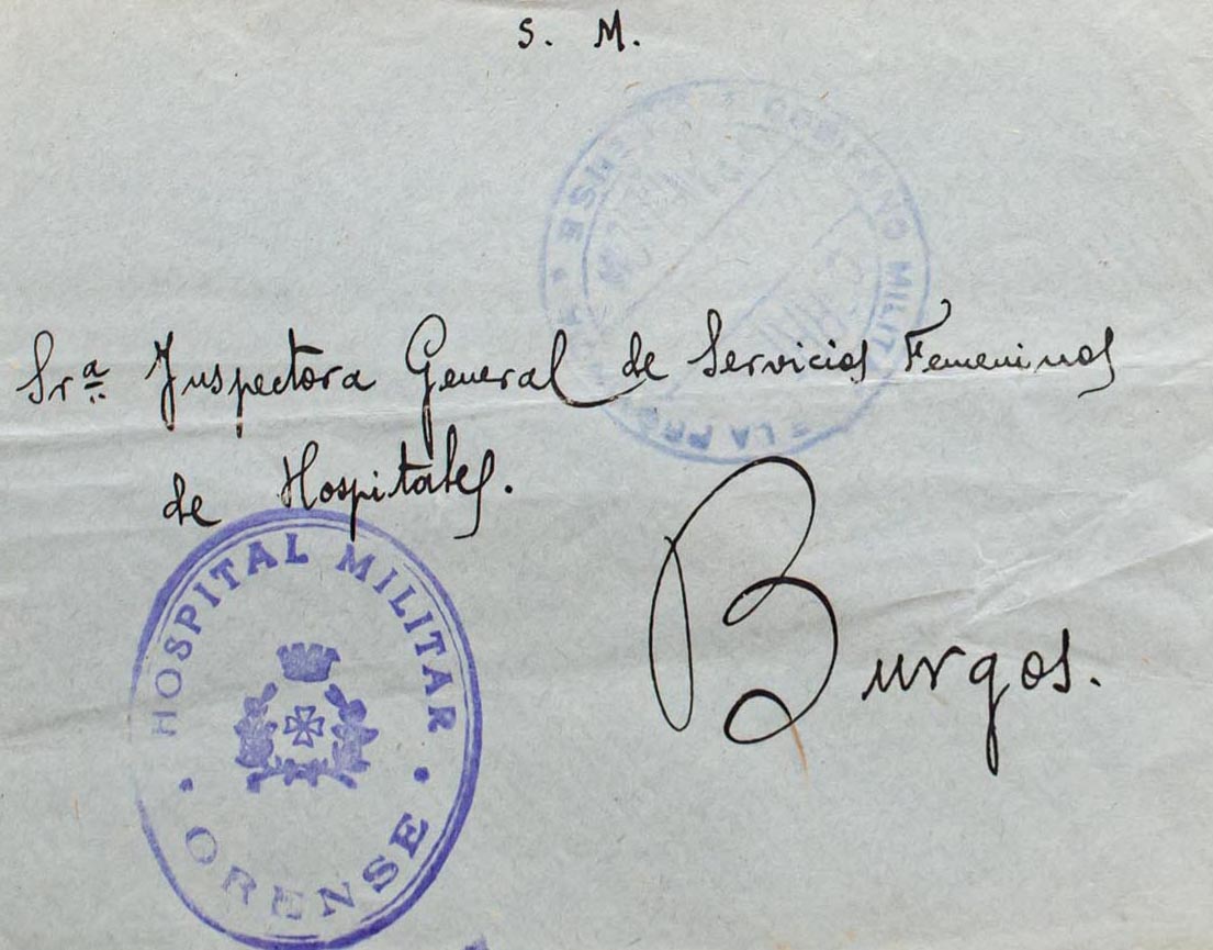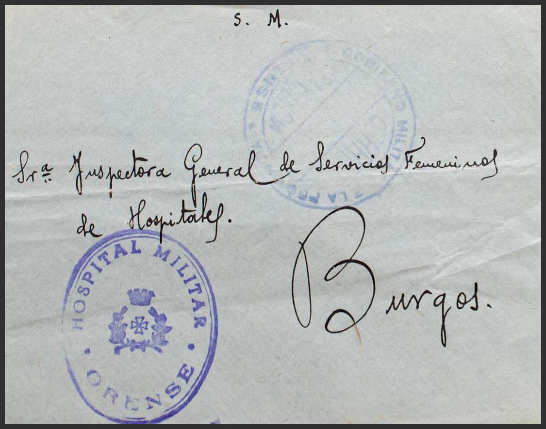 (1939ca). ORENSE to BURGOS. Franchise brands GOVERNMENT MILITARY OF THE PROVINCE / ORENSE and HOSPITAL MILITAR / ORENSE, both in purple. MAGNIFICENT.