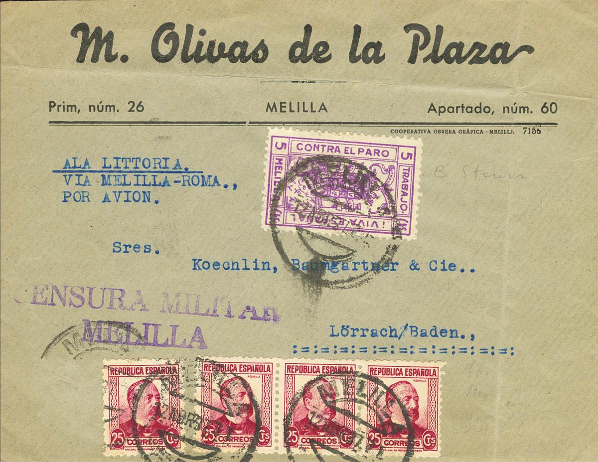 Civil War. Nationalist Side. MILITARY CENSORSHIP / MELILLA, in violet. MAGNIFICENT.