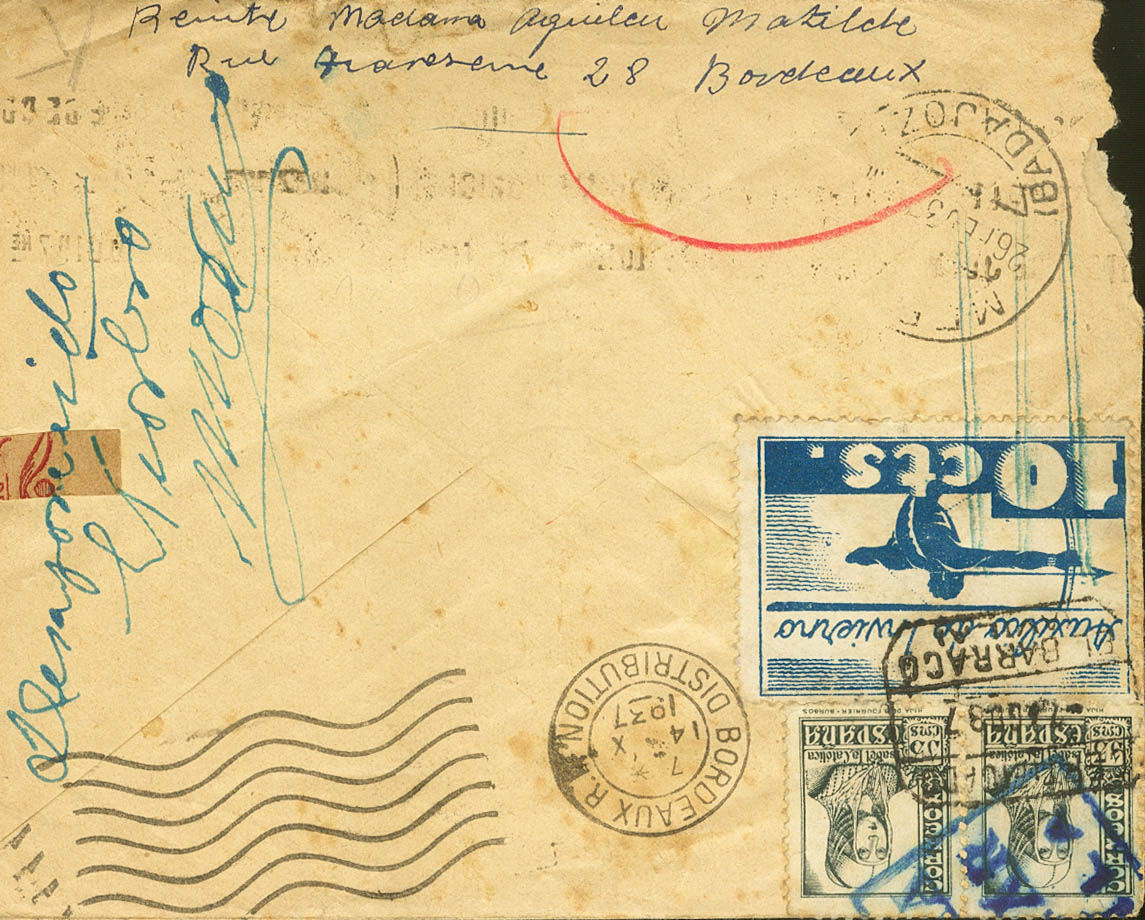 |ENVELOPE| 820(2). 1937. 1´50 f blue from France. BORDEAUX to MERIDA, returned to sender, applying two 15 cts stamps and a 10 cts Charity stamp on the back, with the annotation "Unknown". NICE AND UNUSUAL.