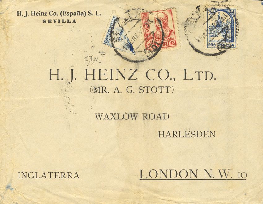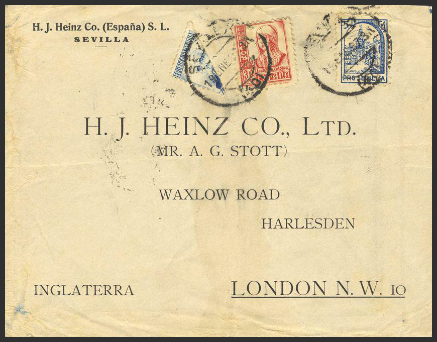 660, 823. 1937. 40 cts, bisected, 30 cts carmine and 5 cts local stamp SEVILLA. SEVILLE to LONDON. On the back arrival. MAGNIFICENT.