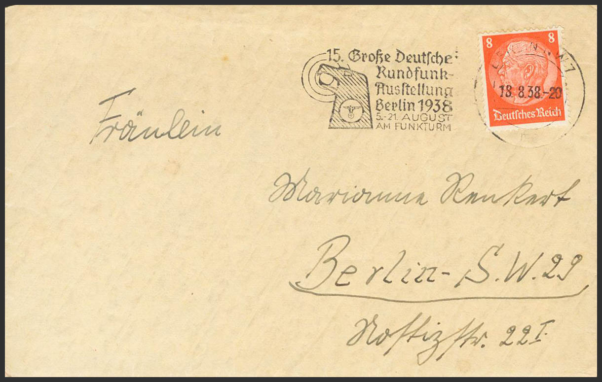 English 1938. (August 14). 8p orange. Complete letter from a member of the LEGION CONDOR (Kurt Mugai) addressed to BERLIN (GERMANY). The letters from the members of the Condor Legion traveled by diplomatic bag from the German Embassy in Spain to Berlin, where they were stamped and sent to the recipients, on the back of the envelopes, the date of receipt was applied with a numerator, that is, this we can know that this pilot during those dates was in the area of the front of the Ebro and on the coast of Castellón and Tarragona. MAGNIFICENT AND VERY RARE ESPECIALLY WITH TEXT.