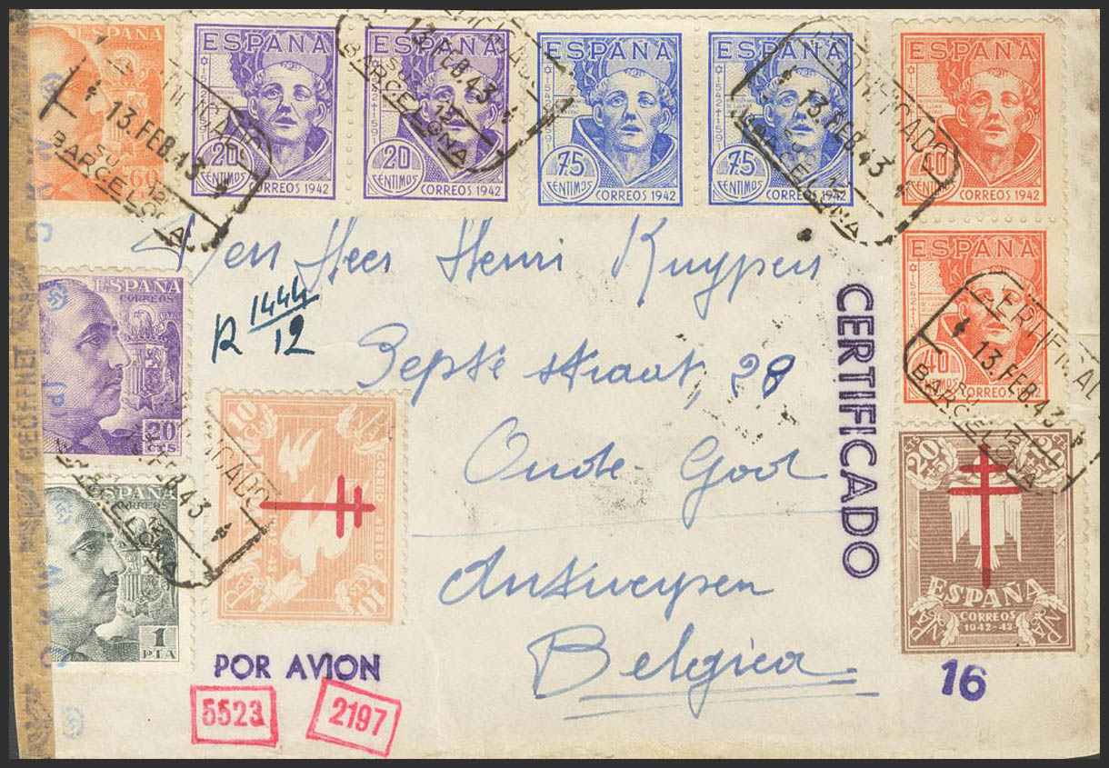 958,960,922,928,930,954(2),956. 1943. 20 cts+5 cts chestnut, 10 cts salmon and various values. Front of Certificate from BARCELONA to ANTWERP (BELGIUM). MAGNIFICENT AND SPECTACULAR POSTAGE.