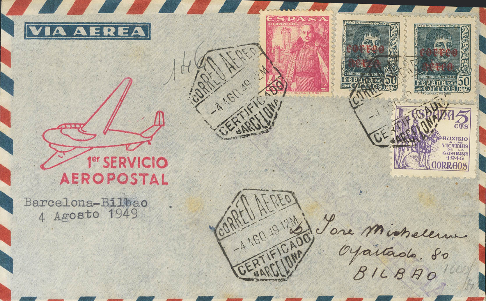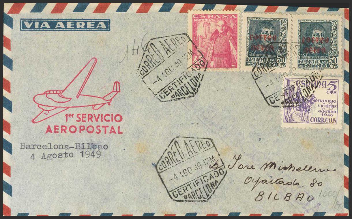 1062, 845(2), 1028A. 1949. 5 cts violet, 50 cts slate, two stamps and 45 cts pink. Certificate from BARCELONA to BILBAO. On the front it marks 1ER SERVICIO / AEROPOSTAL, in pink and typewriter BARCELONA-BILBAO AUGUST 4, 1949, on the back arrival. MAGNIFICENT.