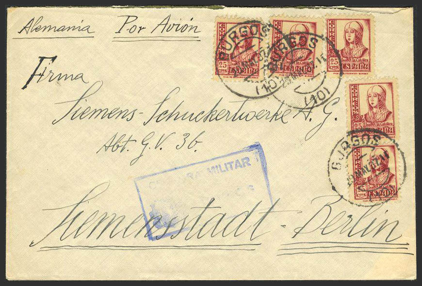 822(5). 1937. 25 carmine cts, five stamps. BURGOS to BERLIN. Postmark BURGOS / (10), on the front mark CENSURA MILITAR / BURGOS, transported "BY AIR MAIL". MAGNIFICENT.