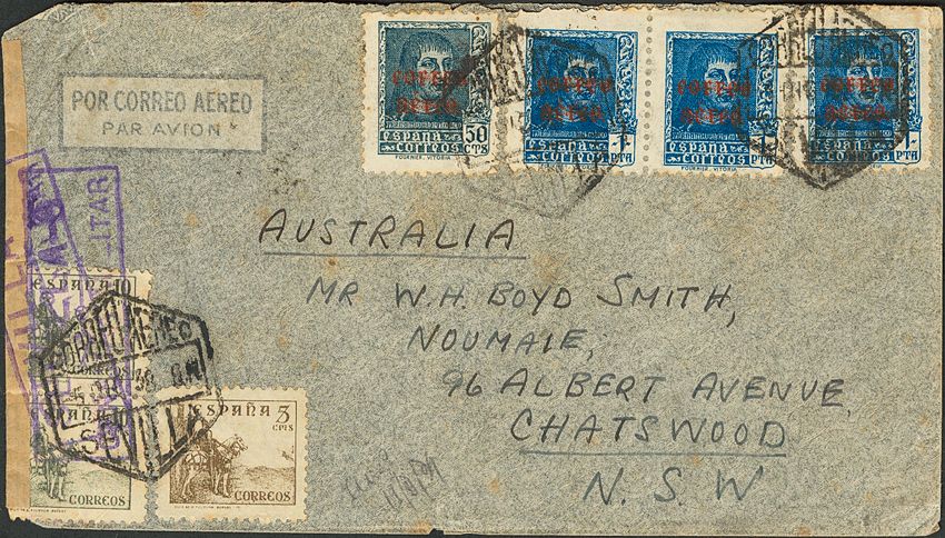 816,817(2),845,846(3). 1938. 5 cts, 10 cts, pair, 50 cts and 1 pts, pair and one stamp. SEVILLE to CHATSWOOD (AUSTRALIA). Postmark AIR MAIL / SEVILLE. MAGNIFICENT.