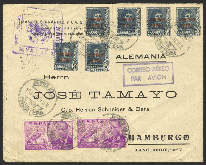 845(6), 882(2). 1938. 50 cts., strip of four and two stamps and 35 cts., pair. SHERRY to HAMBURG (GERMANY). Postmark JEREZ DE LA / FRONTERA, transported by "CORREO AEREO" and marked CENSURA MILITAR / JEREZ DE LA FRONTERA. MAGNIFICENT.
