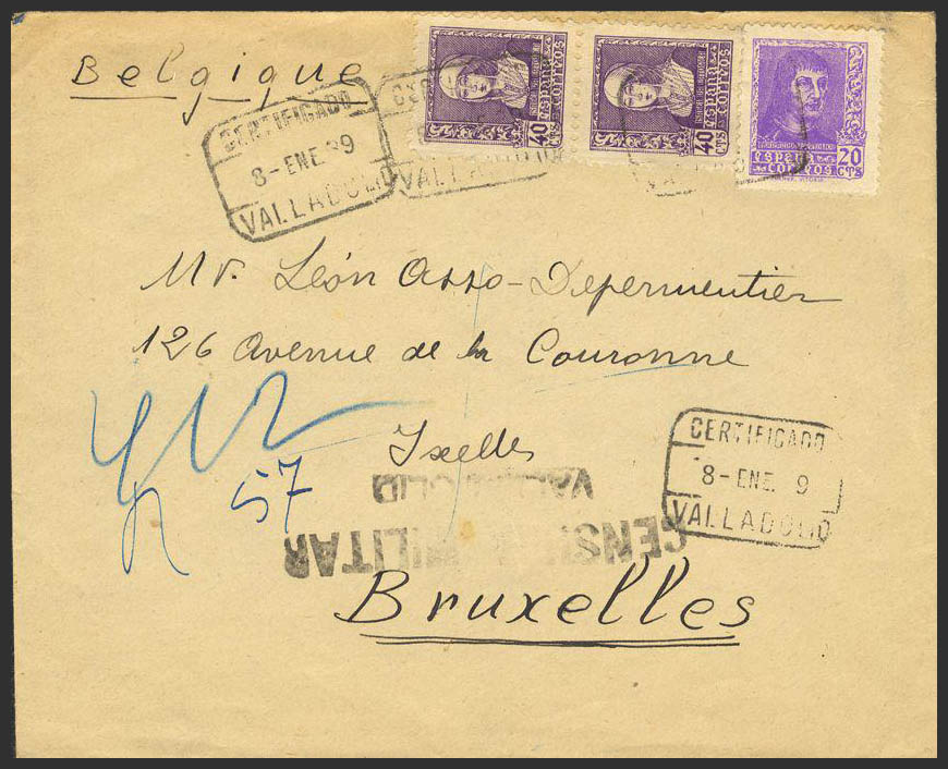 English 842,858(2). 1939. 20 cts, 40 cts, pair. VALLADOLID to BRUSSELS. CERTIFIED postmark / VALLADOLID. MAGNIFICENT.
