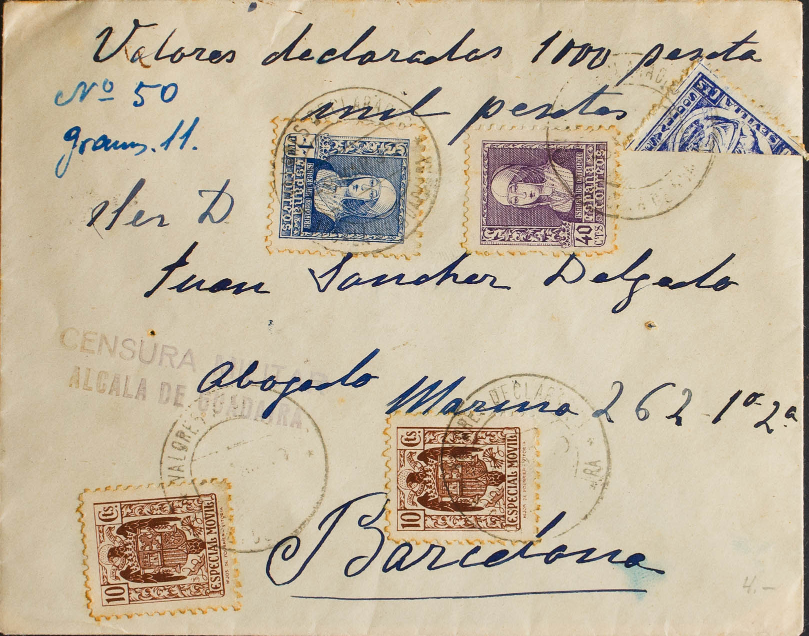 858, 860. 1939. 40 cts purple, 1 pts blue, 10 cts chestnut (Special Mobile), two stamps and 10 cts Beneficial blue PRO DEVALIDOS (bisected). Declared Value of ALCALA DE GUADAIRA to BARCELONA. On the back arrival. BEAUTIFUL AND VERY RARE.