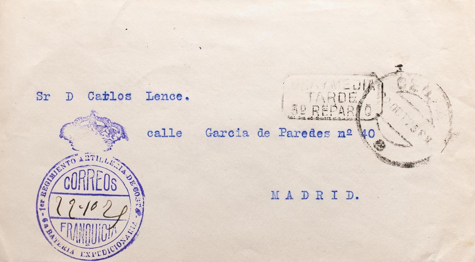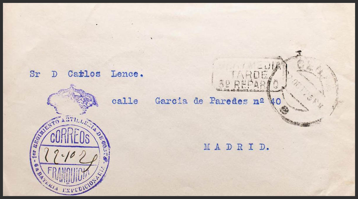 Civil war. National Side Military Censorship. 1ST COAST ARTILLERY REGIMENT / 6TH EXPEDITIONARY FLAG, arrival on the back. MAGNIFICENT.