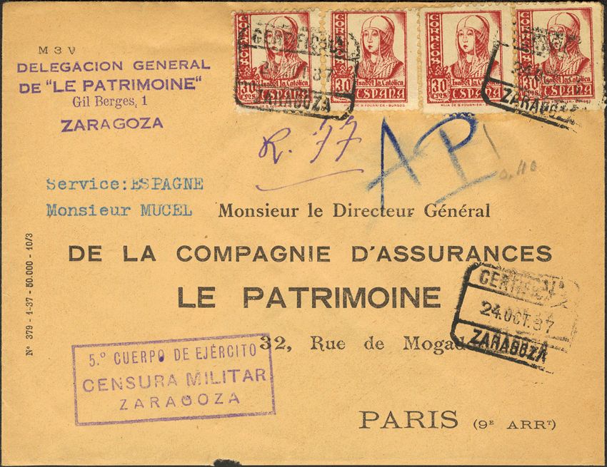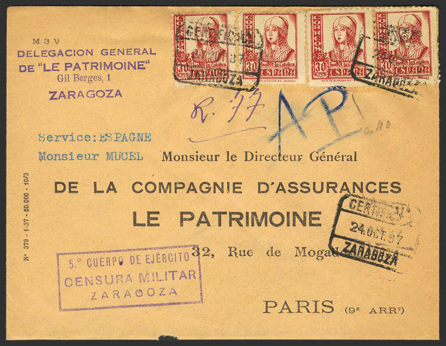823(4). 1937. 30 cts. carmine, four seals. ZARAGOZA to PARIS. CERTIFICATE / ZARAGOZA postmark, on the front CENSURE / MILITARY. MAGNIFICENT.