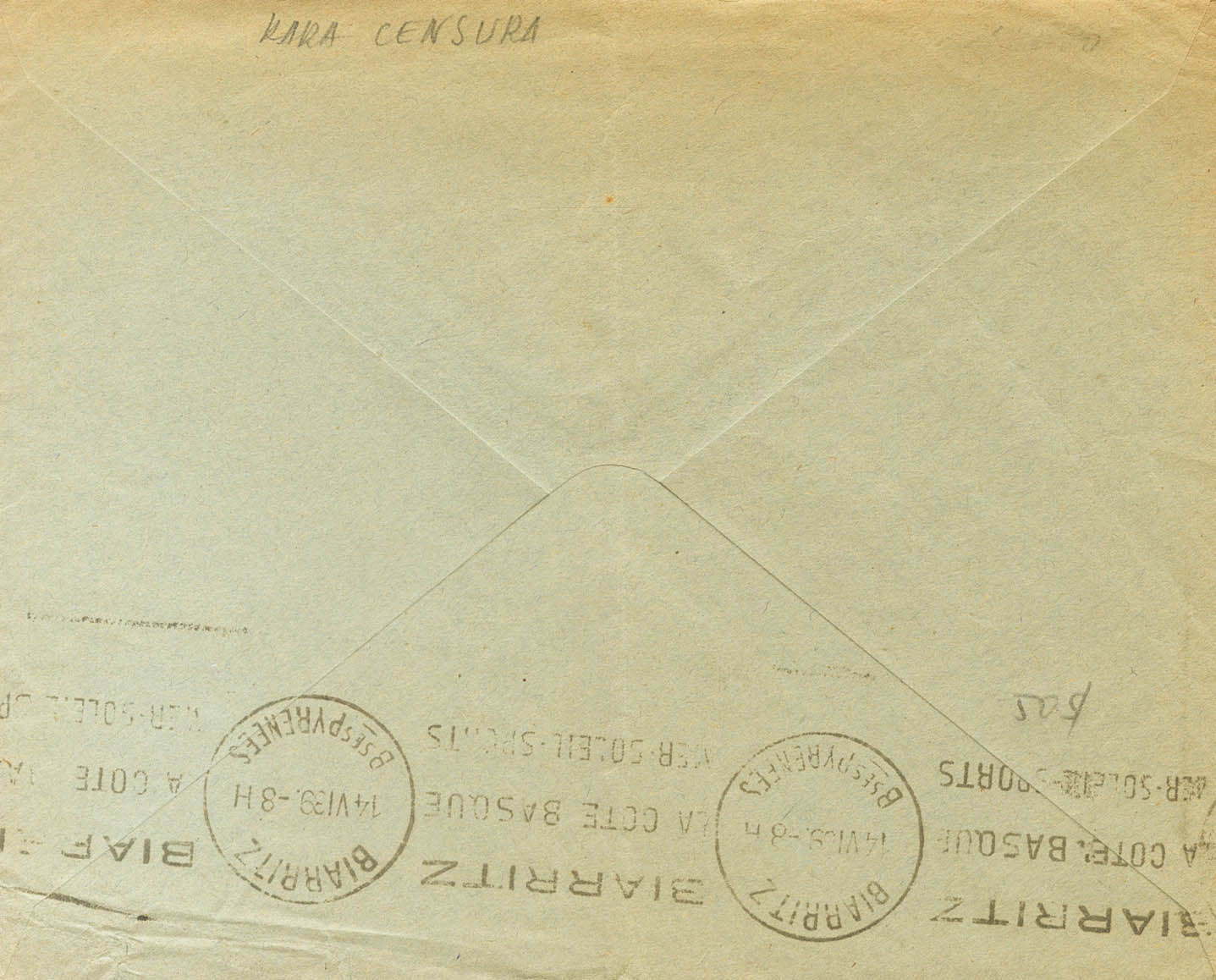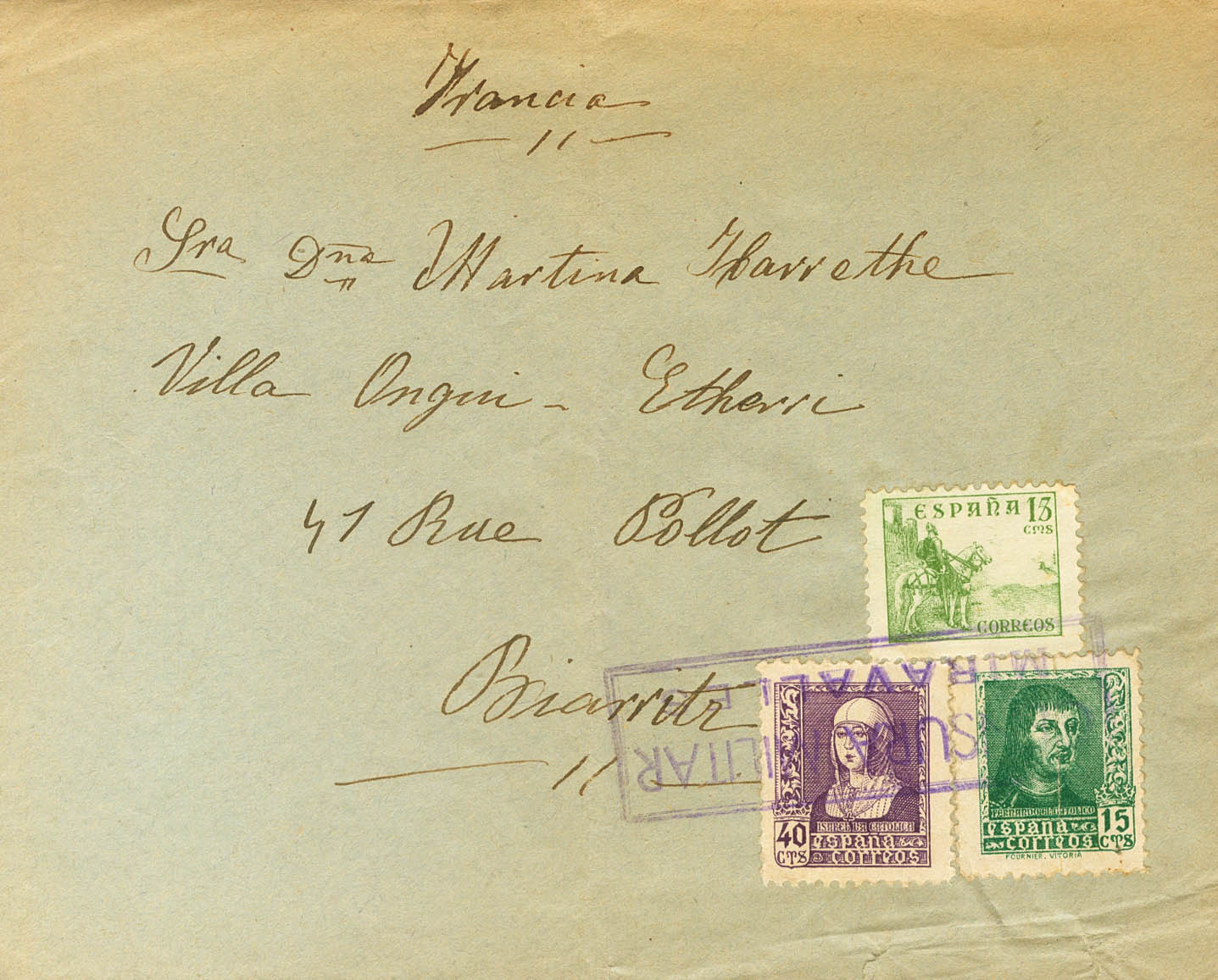 |ENVELOPE| 841, 858, 819. 1939. 15 cts green, 40 cts violet and 15 cts yellow green. MIRAVALLES (VIZCAYA) to BIARRITZ (FRANCE). MILITARY CENSORSHIP / MIRAVALLES postmark, in violet and arrival on the back. MAGNIFICENT AND VERY RARE.
