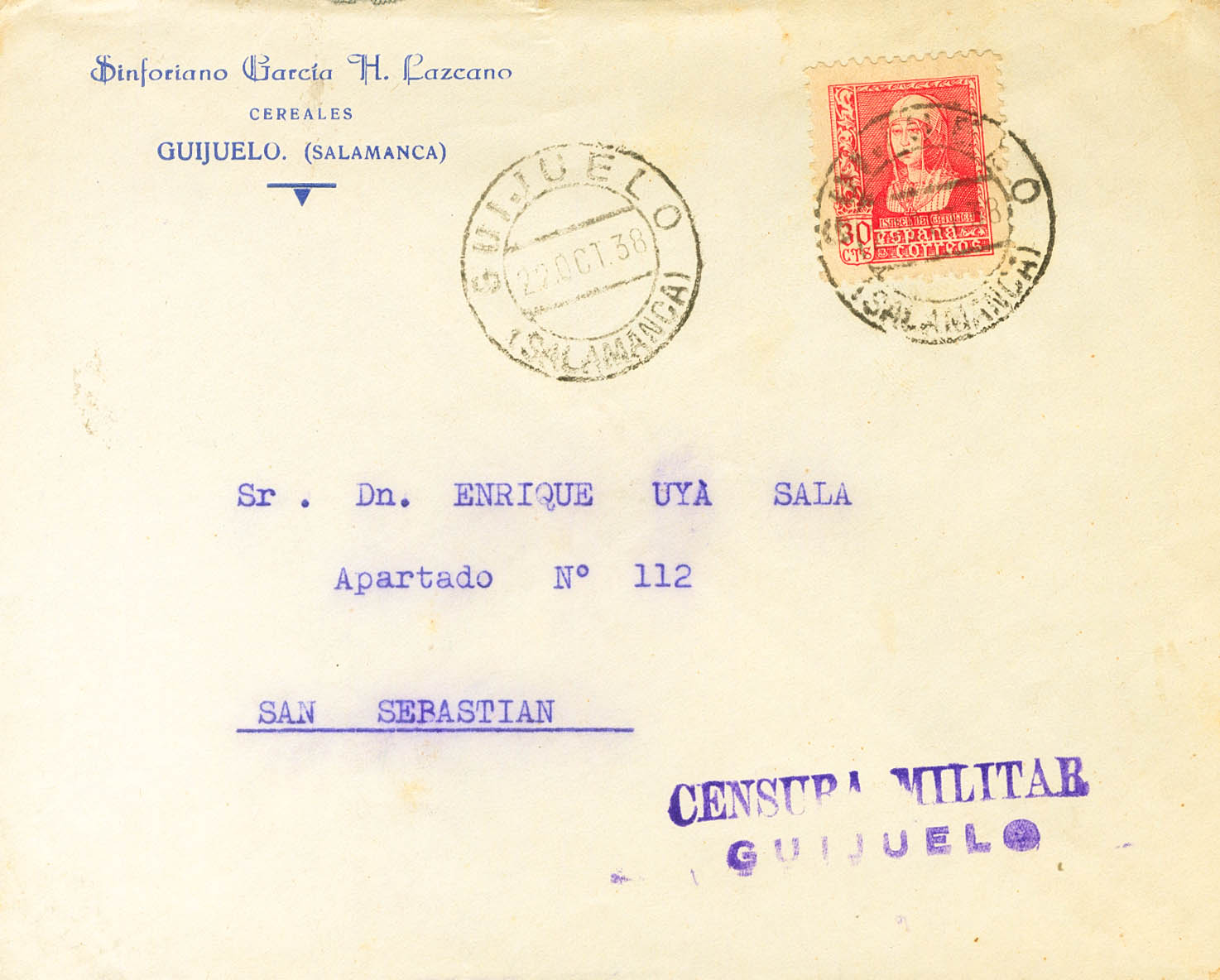 |ENVELOPE| 857. 1938. 30 cts pink. GUIJUELO (SALAMANCA) to SAN SEBASTIAN. On the front marks MILITARY CENSORSHIP / GUIJUELO, in violet. MAGNIFICENT.
