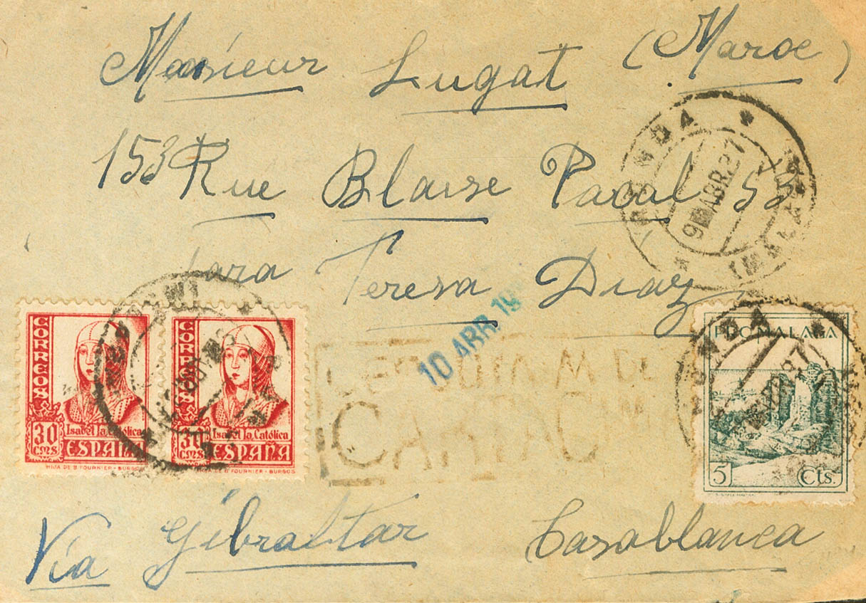 |ENVELOPE| 823(2). 1937. 30 cts pink, two stamps and Local 5 cts green. CARTAJIMA (MALAGA) to CASABLANCA (MOROCCO). On the front marks CENSURA MILITAR / CARTAJIMA, in sepia. MAGNIFICENT AND VERY RARE, NOT REVIEWED.