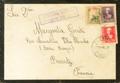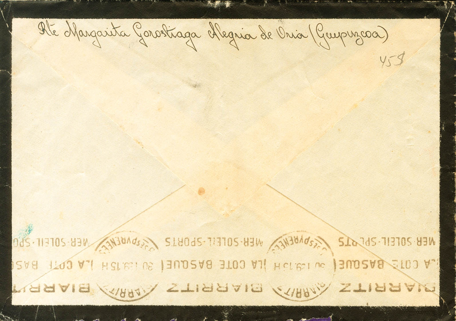 |ENVELOPE| 857, 858, 817. 1939. 30 cts pink, 40 cts violet and 10 cts green. ALEGRIA DE ORIA (GUIPUZCOA) to BIARRITZ (FRANCE). On the front marked CENSURA MILITAR / ALEGRIA DE ORIA, on the back arrival. MAGNIFICENT AND VERY RARE.