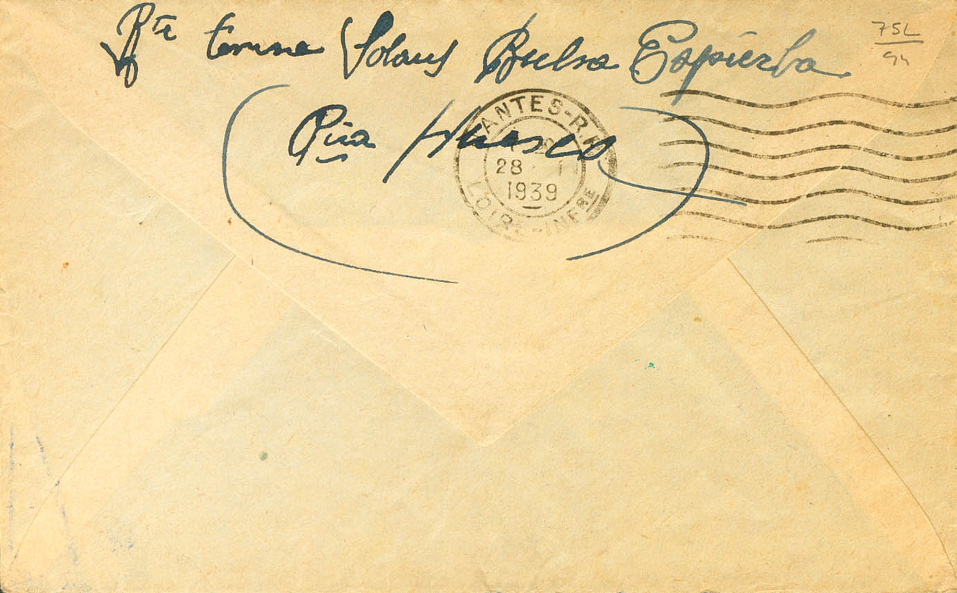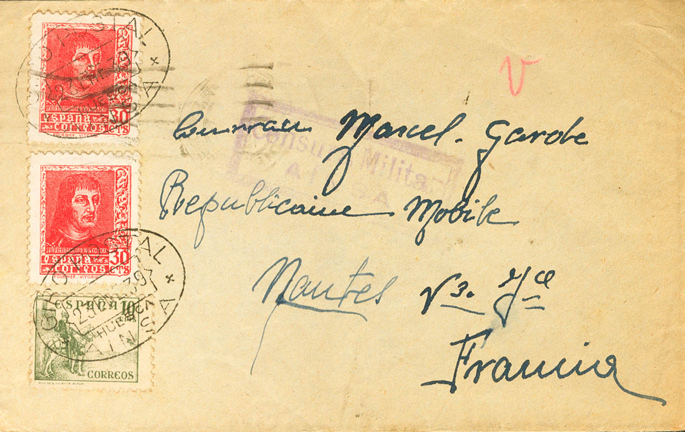|ENVELOPE| 844(2), 817. 1939. 30 cts red, two stamps and 10 cts green. ESPIERBA (HUEUncirculatedA) to NANTES (FRANCE). Postmark GIRO POSTAL / HUEUncirculatedA / AINSA and on the front mark CENSURA MILITAR / AINSA, in violet and on the back arrival. MAGNIFICENT AND VERY RARE, NOT REVIEWED.