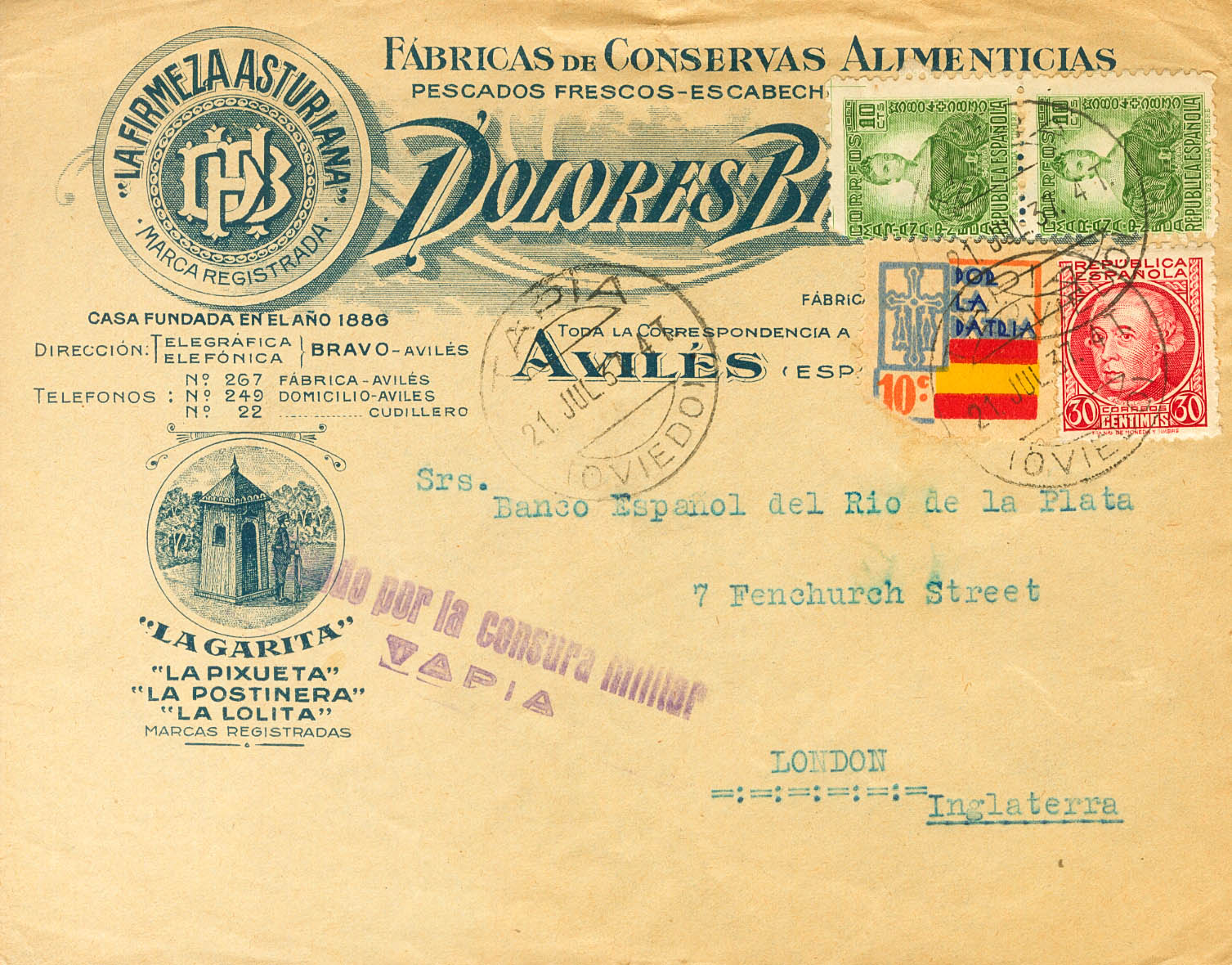 |ENVELOPE| 682(2), 687. 1937. 10 cts green, two stamps, 30 cts carmine and 10 cts Charity (corner tear, unimportant). TAPIA DE CASRIEGO (ASTURIAS) to LONDON (ENGLAND). On the front marks VISA BY MILITARY CENSORSHIP / TAPIA, in violet. MAGNIFICENT.