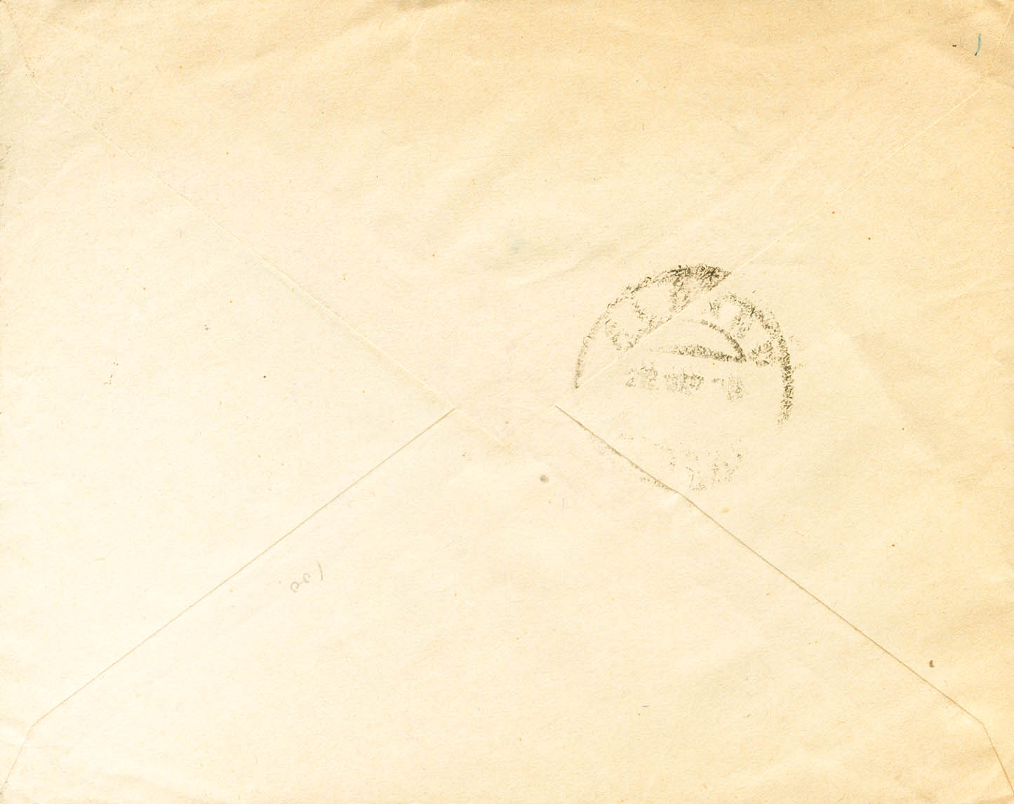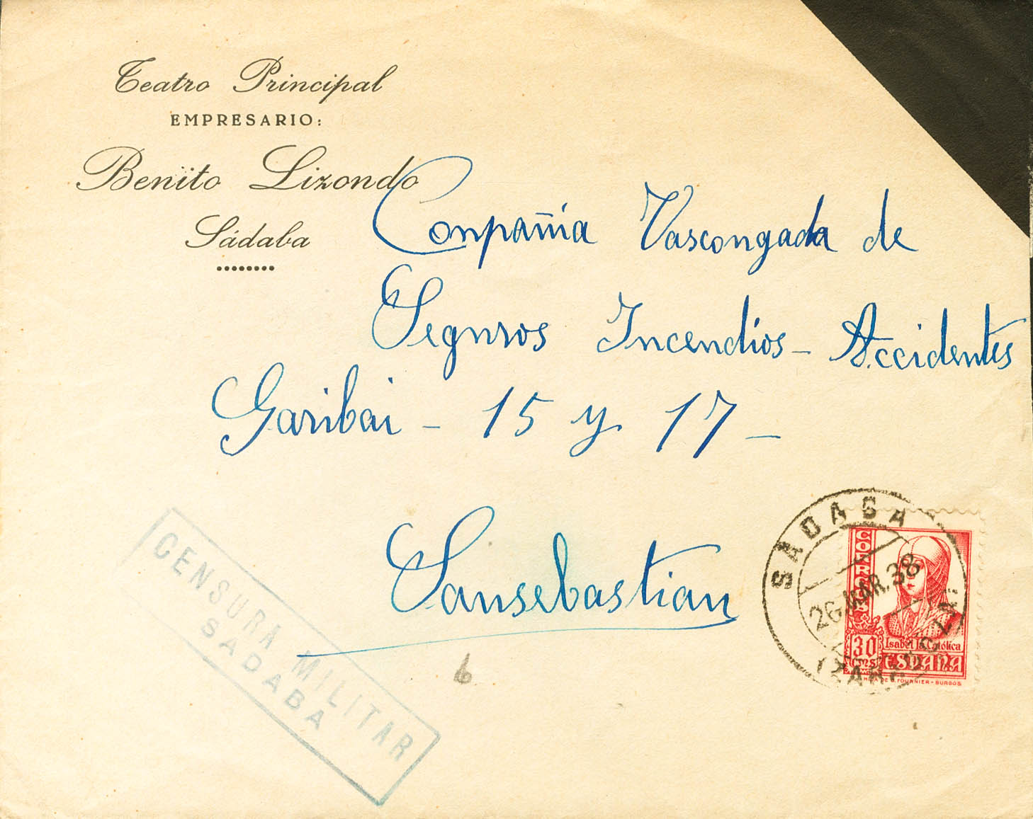 |ENVELOPE| 823. 1938. 30 cts pink. SADABA (ZARAGOZA) to SAN SEBASTIAN. On the front marks CENSURA MILITAR / SADABA, in blue and on the back transit. MAGNIFICENT.