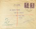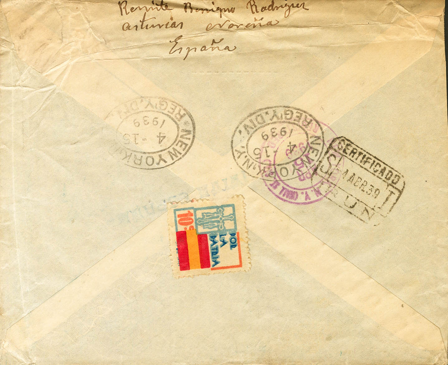 English |ENVELOPE| 858(2). 1939. 40 cts dark violet, two stamps. Certificate from NOREÑA (ASTURIAS) to NEW YORK (USA). On the front marked MILITARY CENSORSHIP / NOREÑA, in violet and on the back arrival. MAGNIFICENT AND VERY RARE.