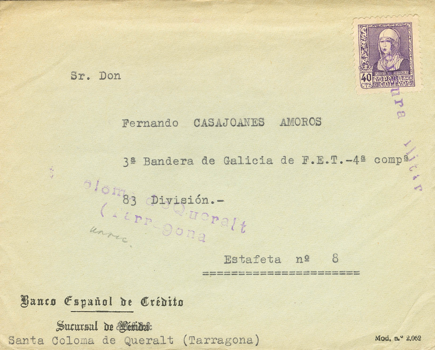 Civil war. National Side Military Censorship. MILITARY CENSORSHIP / SANTA COLOMA QUERALT / (TARRAGONA). MAGNIFICENT.