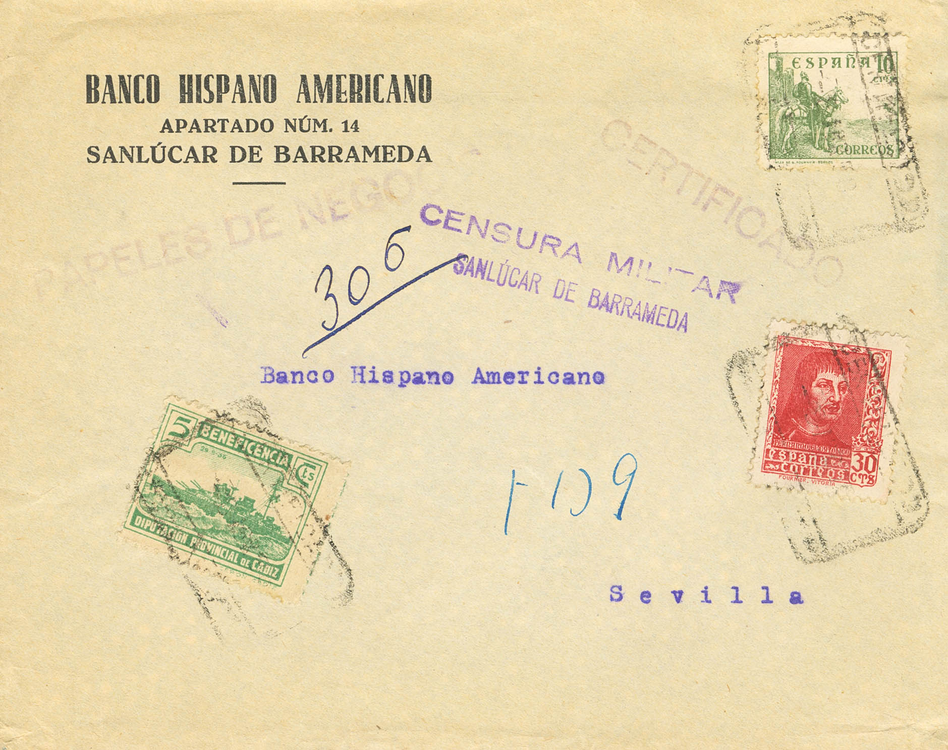 Civil War. Military Censorship Nationalist Order. MILITARY CENSORSHIP / SAN LUCAR DE VARRAMEDA, in Cadiz, arrival on the back. MAGNIFICENT.
