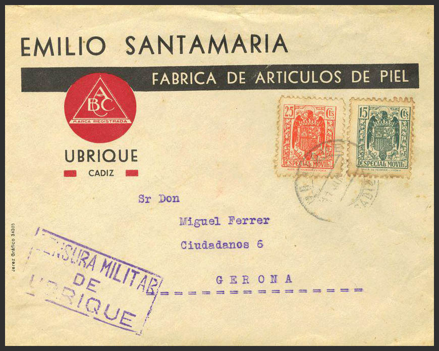 English Fis 103, 105. 1939. 15 cts green and 25 cts red MOBILE. UBRIQUE to GERONA. MAGNIFICENT.