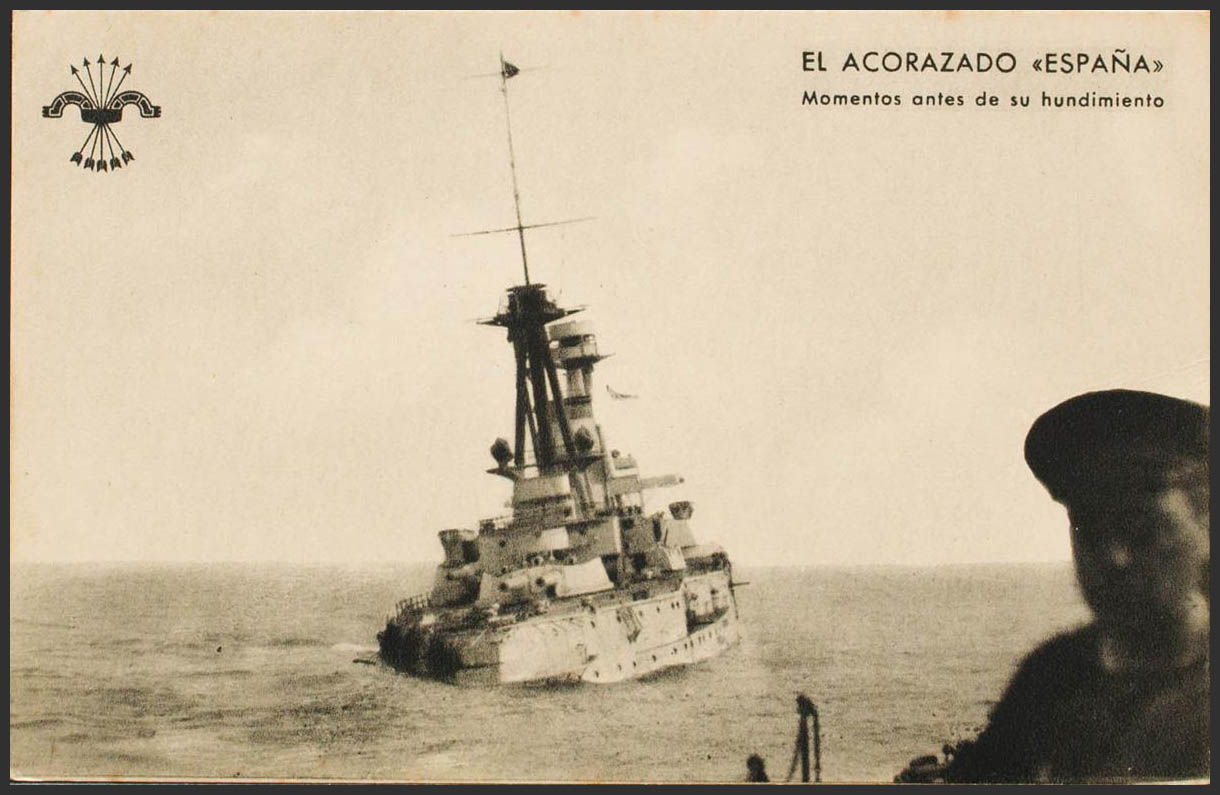 English (★)1937. Postcard of the Spanish Falange with an image of THE BATTLESHIP SPAIN, moments before its sinking. MAGNIFICENT.